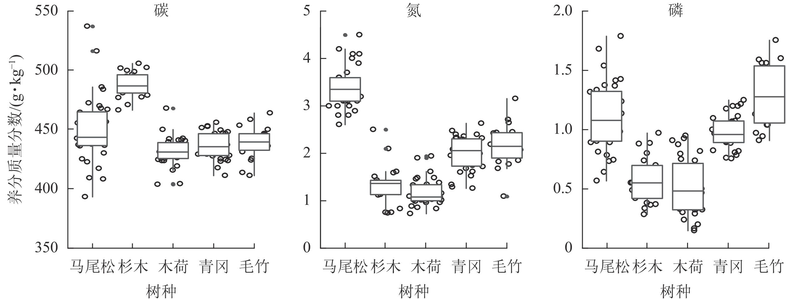 n=3~5小样本取样量的同时,将±10%估算误差范围考虑在内。其他树种碳、氮、磷质量分数估算时,取样量