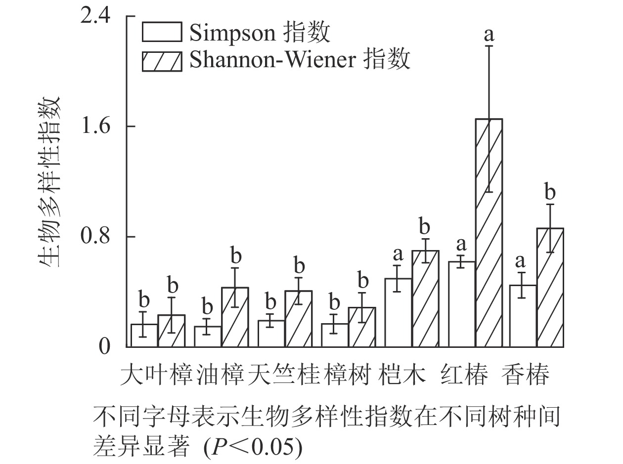 P<0.05),并且红椿、桤木和香椿林分林下草本的Simpson指数显著高于天竺桂、樟树、大叶樟和油樟林分,红椿林分的林下草本Shannon-Wiener指数显著高于其他6个林分(