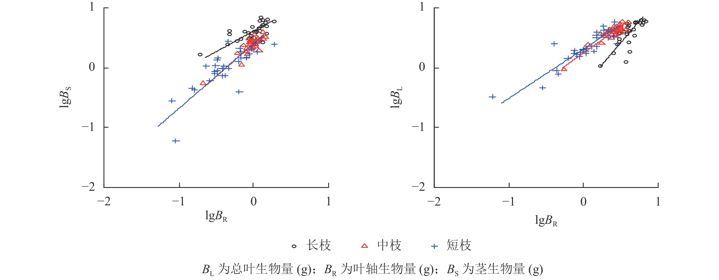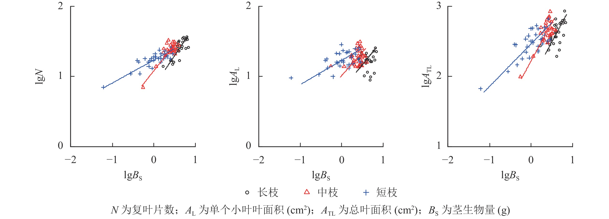 结果不同类型枝条的叶片和茎之间具有不同的生长规律,其中在总叶面积和茎生物量关系上,长枝和中枝上均为同速生长关系(斜率分别为1.170和1.135),而在短枝上为异速生长关系(斜率为0.657);在叶片生物量和茎生物量分配关系上,长枝、中枝和短枝分别表现为异速、同速、异速生长关系,回归方程的斜率依次为1.460、0.908和0.840。共同表明长枝和中枝具有更高的叶片生长能力,功能上侧重于扩展空间和光合生产,短枝的功能与有性繁殖过程有关。叶轴对叶片生长也有调节作用,在中枝和短枝上能够弥补茎对叶面积支持效率的不足,但在长枝上作用不明显。