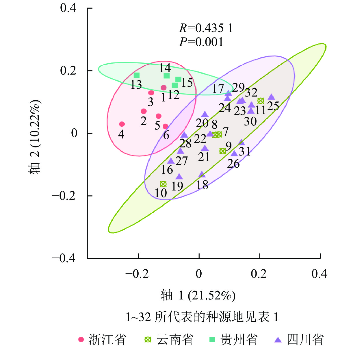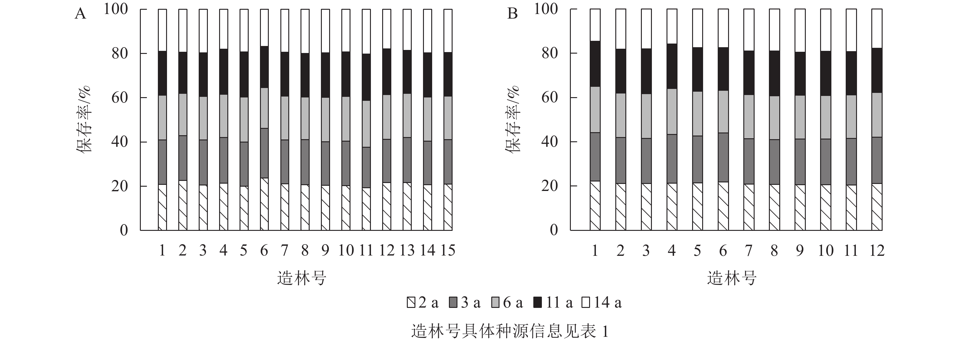结果种源试验林的保存率在林龄为11~14 a有较明显下降;各林龄的树高、胸径、单株材积在种源间存在极显著差异(
