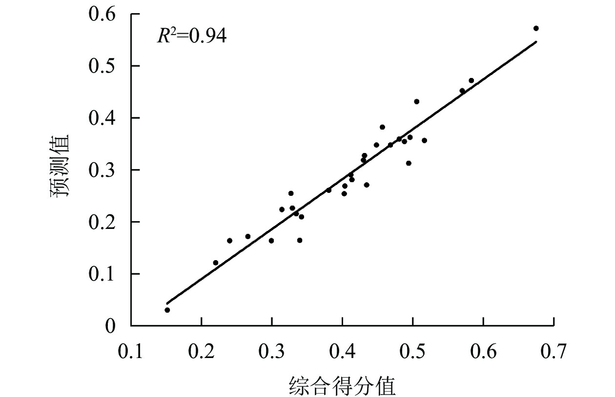 P<0.05)。主成分分析将11个评价指标简化为4个较为独立的综合指标,累计贡献率达80.23%,保留了供试材料各性状的大部分信息。根据4个综合指标的权重以及隶属函数值,优树综合得分范围为0.151~0.674,其中HY25、HY4、HY20、HY17和HY1综合评价表现较好。采用逐步回归分析建立广宁红花油茶优树评价预测模型,筛选出冠幅面积、单株产果效率、单株产油量、鲜出籽率、干籽出仁率和鲜果含油率等6个核心评价指标。基于6个核心指标采用聚类分析可将31株样株分为3类,第Ⅰ类属于优质型;第Ⅱ类丰产性和优质性较好;第Ⅲ类属于丰产型。