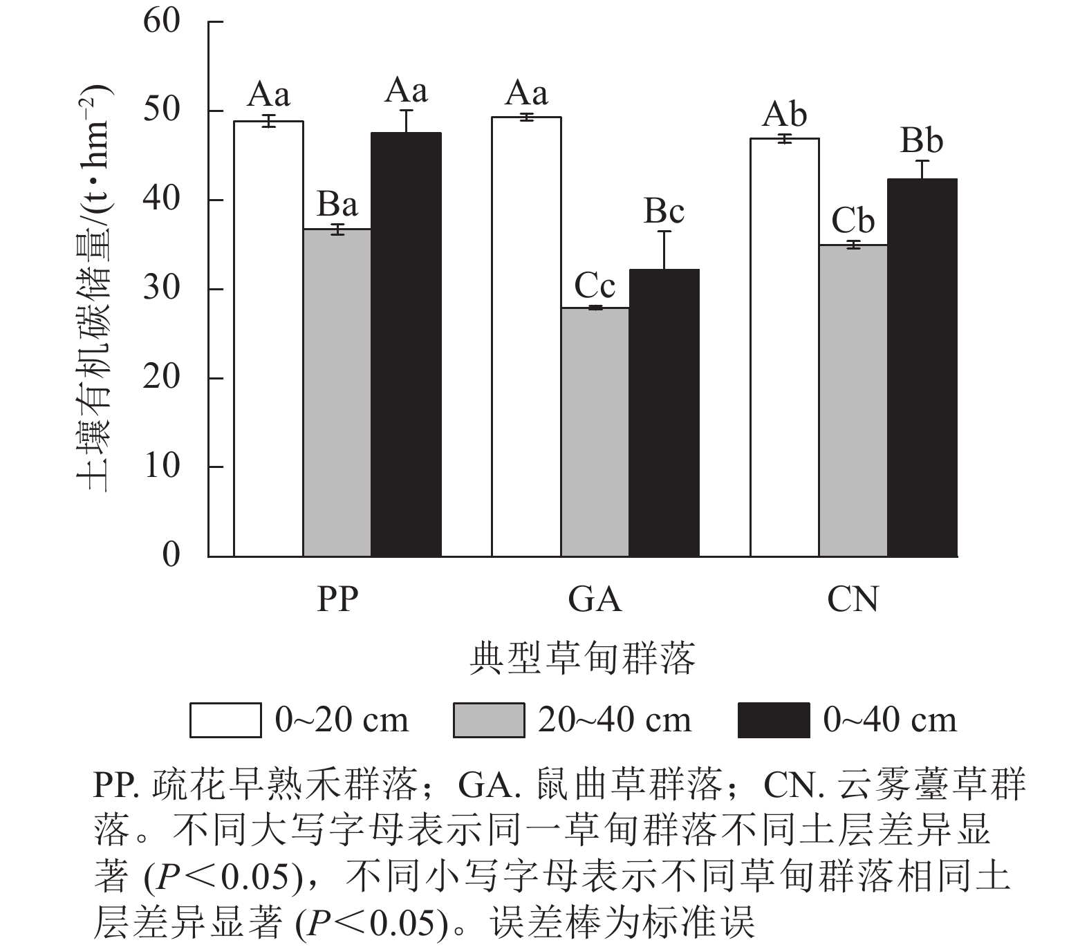 结果随着地下水埋深降低,不同典型草甸群落土壤总有机碳储量(0~40 cm土层)呈减少趋势,从高到低依次为疏花早熟禾群落(47.55 t ·hm