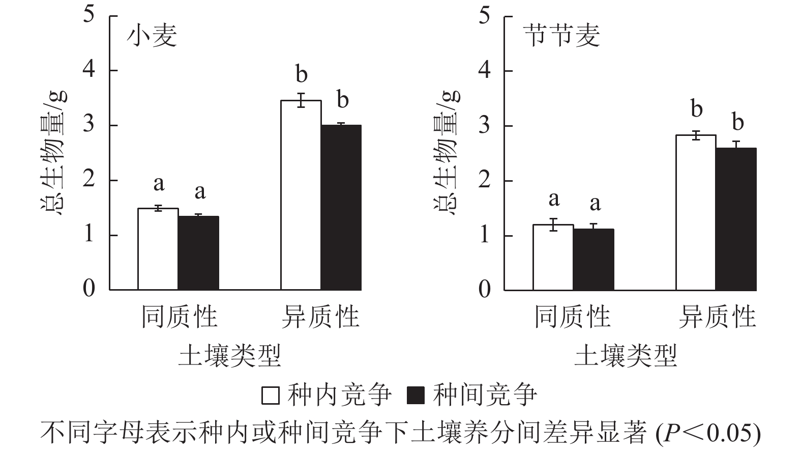 P<0.05)。②种间竞争条件下,异质性土壤中节节麦的根冠比降幅最大,表明节节麦通过将更多的生物量分配至地上以加大对小麦的竞争抑制作用。③从竞争平衡指数可知:异质性土壤中节节麦的竞争平衡指数大于0,并较同质性土壤中略有增加,表明土壤养分异质性一定程度上促进了节节麦对小麦的竞争作用。