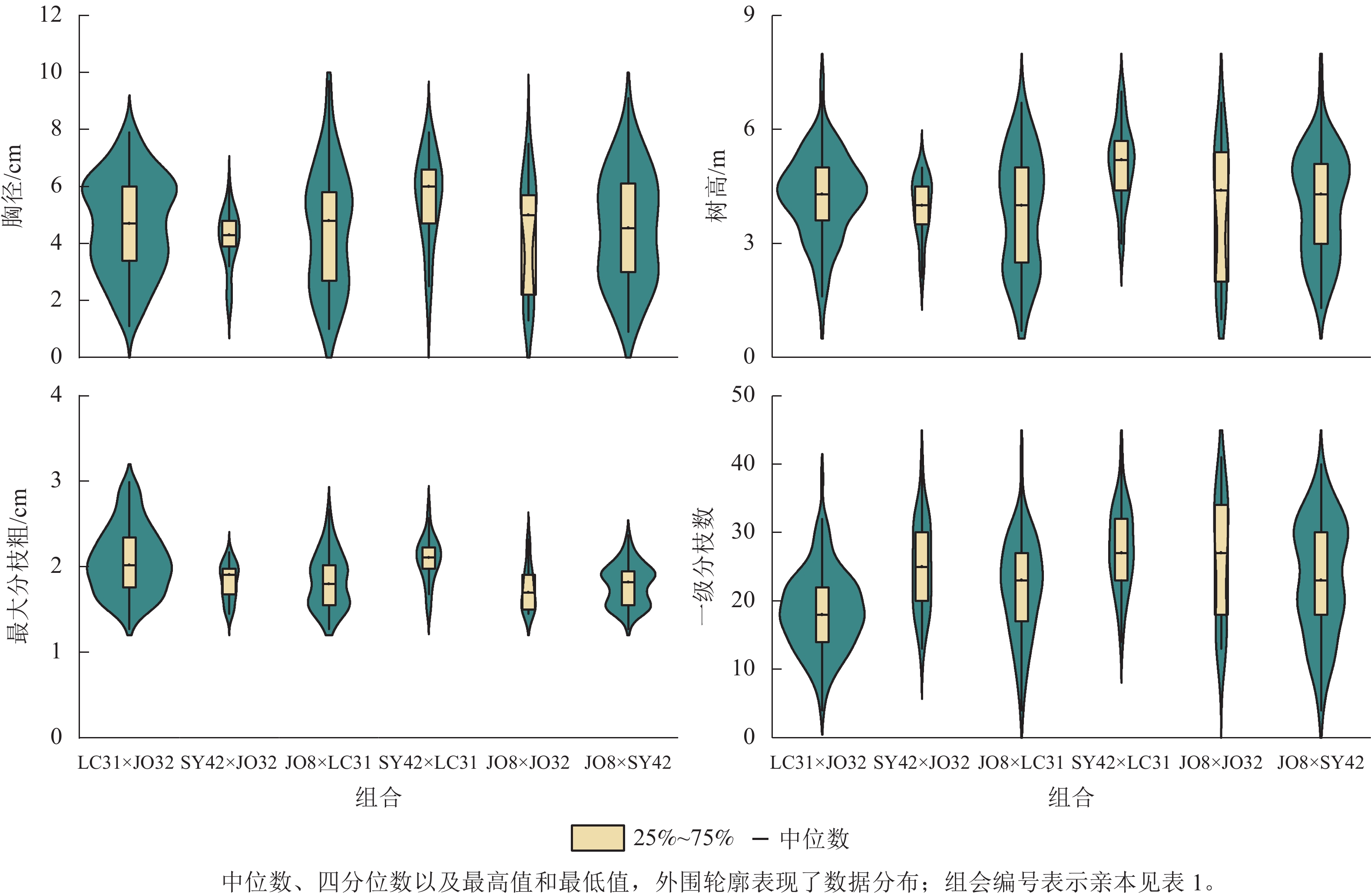 结论6年生木荷全同胞家系生长和分枝性状受较强遗传控制,生长性状父本控制力更强,分枝性状母本控制力更强。根据生长性状和分枝性状分别对亲本进行选配,可以得到速生优质的超级亲本组合。图1表7参27