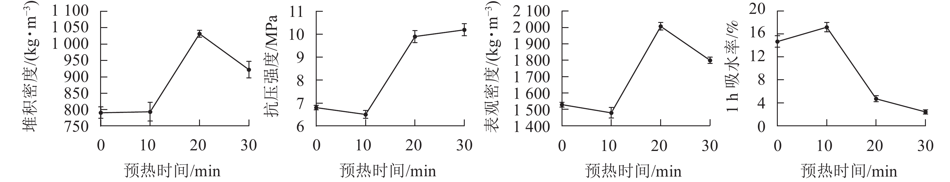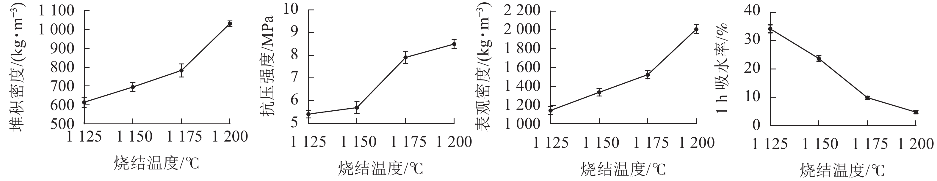 结果炉渣泥中有2种重金属超标,分别为镉和锌。生活垃圾焚烧炉渣泥陶粒在烧制温度为1 175 ℃时,所得陶粒堆积密度和抗压强度有较大增长,1 h吸水率下降。烧结时间在10~15 min时,陶粒1 h吸水率变化幅度最大。预热温度过高,预热时间过长,不利于陶粒产生良好膨胀效果。在最佳烧制工艺条件下,所制得的陶粒堆积密度为783 kg·m