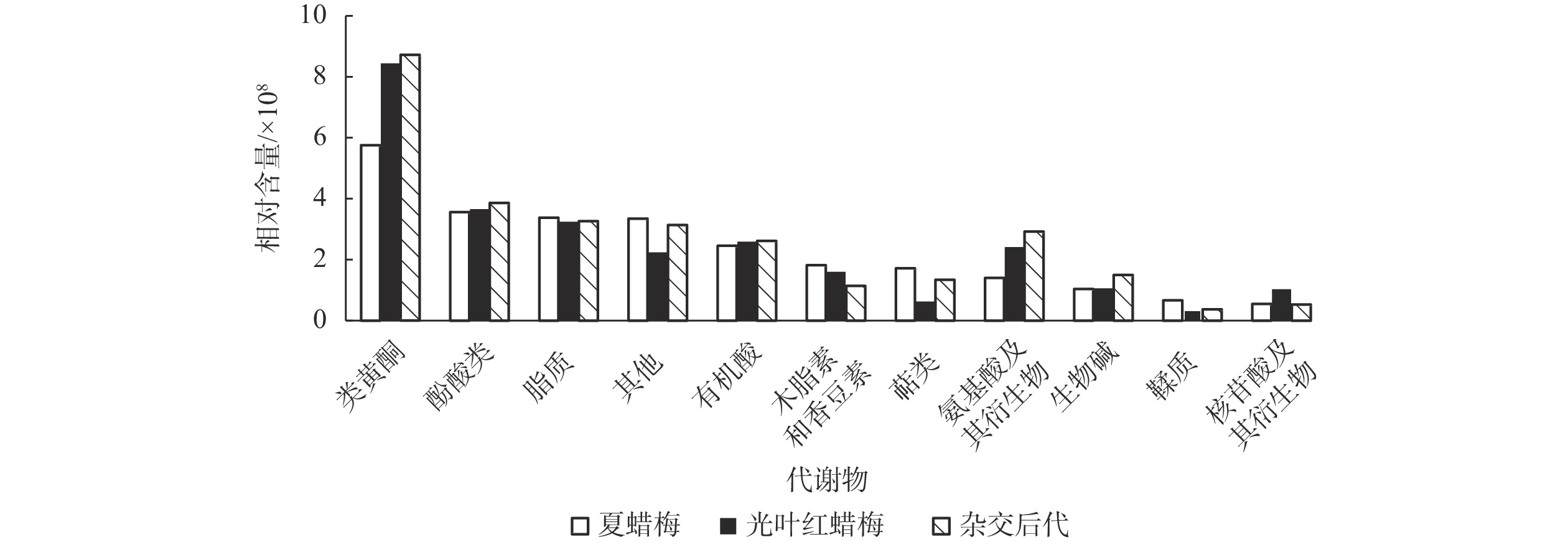 结论夏蜡梅、光叶红蜡梅及其杂交后代花瓣花色表型与代谢物质存在明显差异,3种植物之间主要以类黄酮为主的差异代谢物。图4表5参20