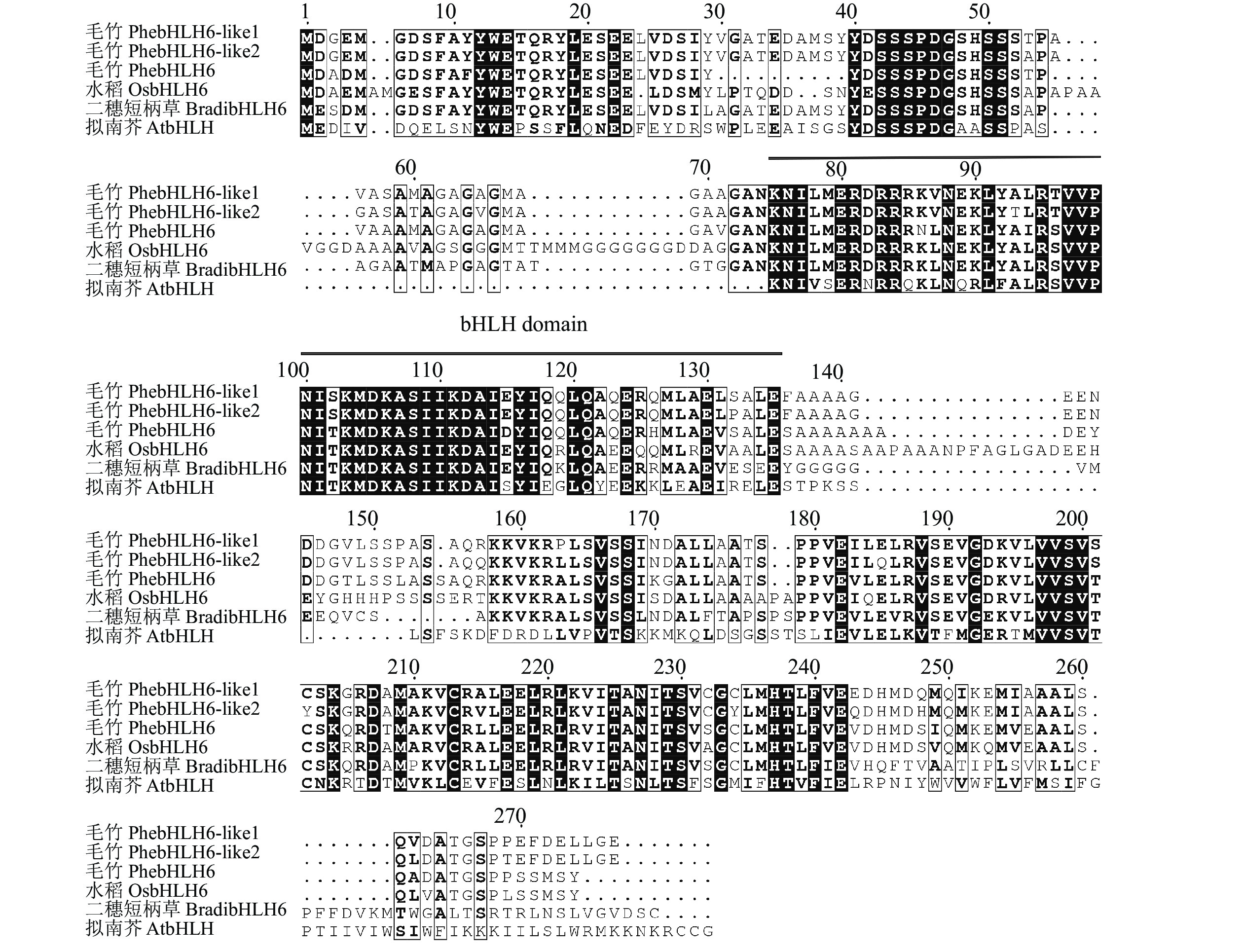 PhebHLH6基因编码区长度为801 bp,编码266个氨基酸,包含bHLH结构域,属于典型的bHLH转录因子。组织特异性表达分析表明:
