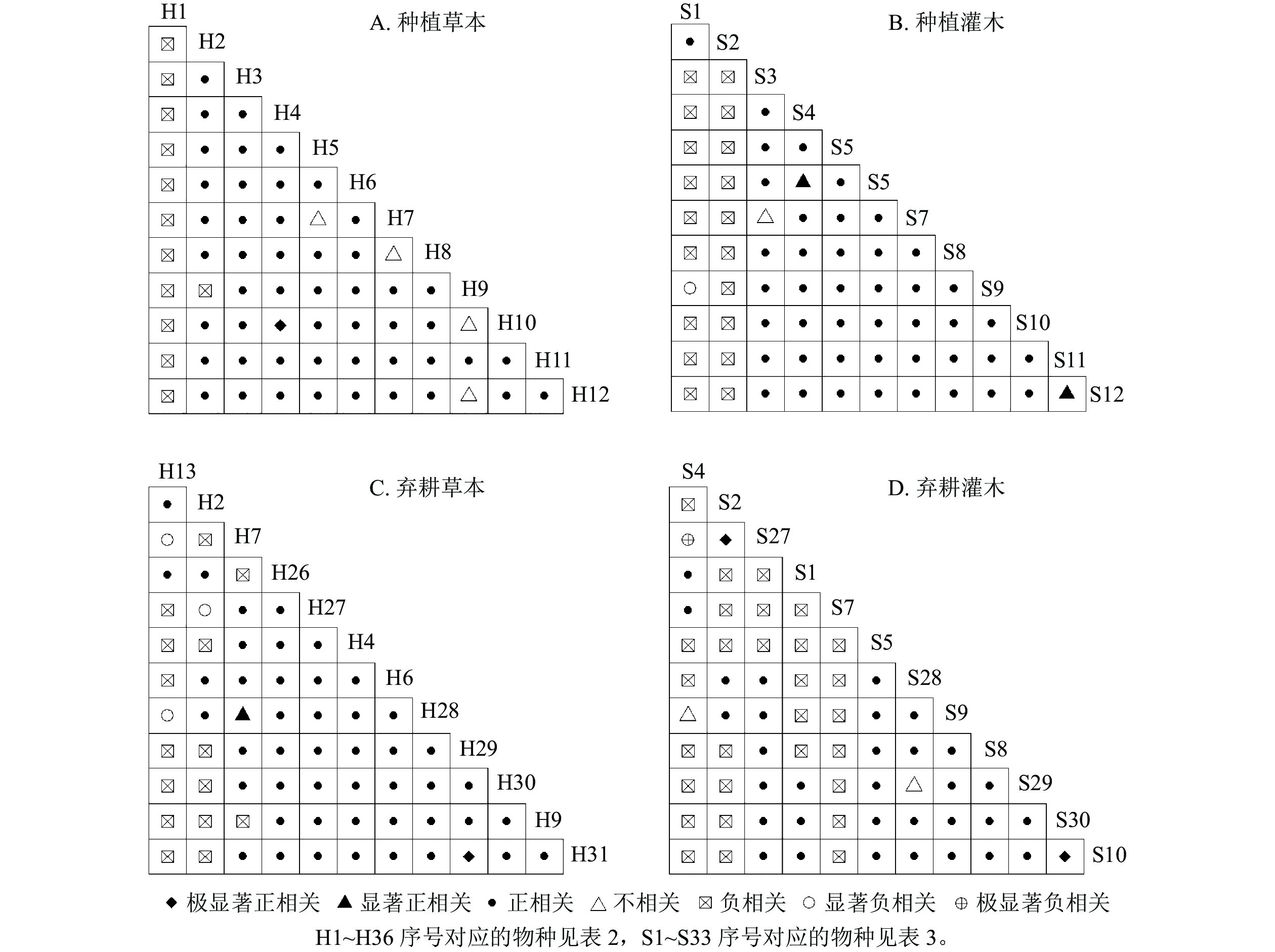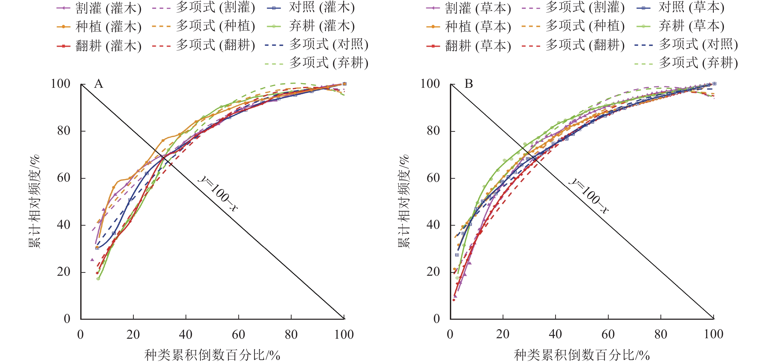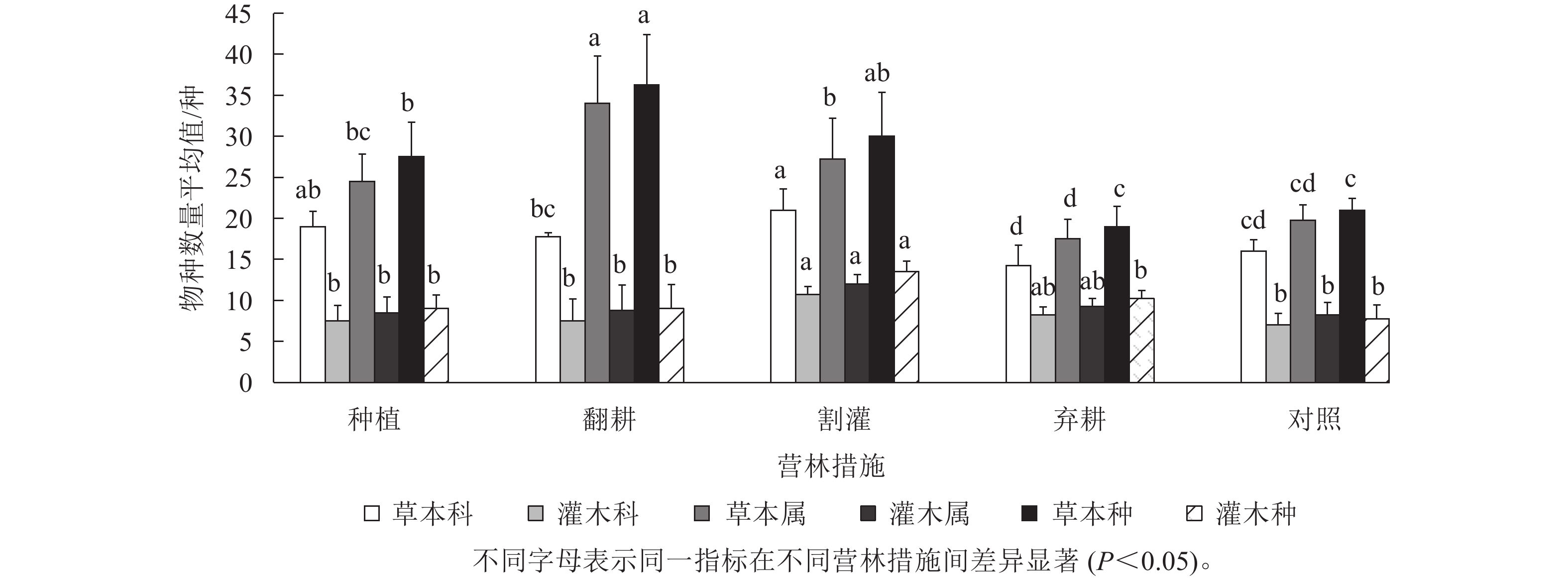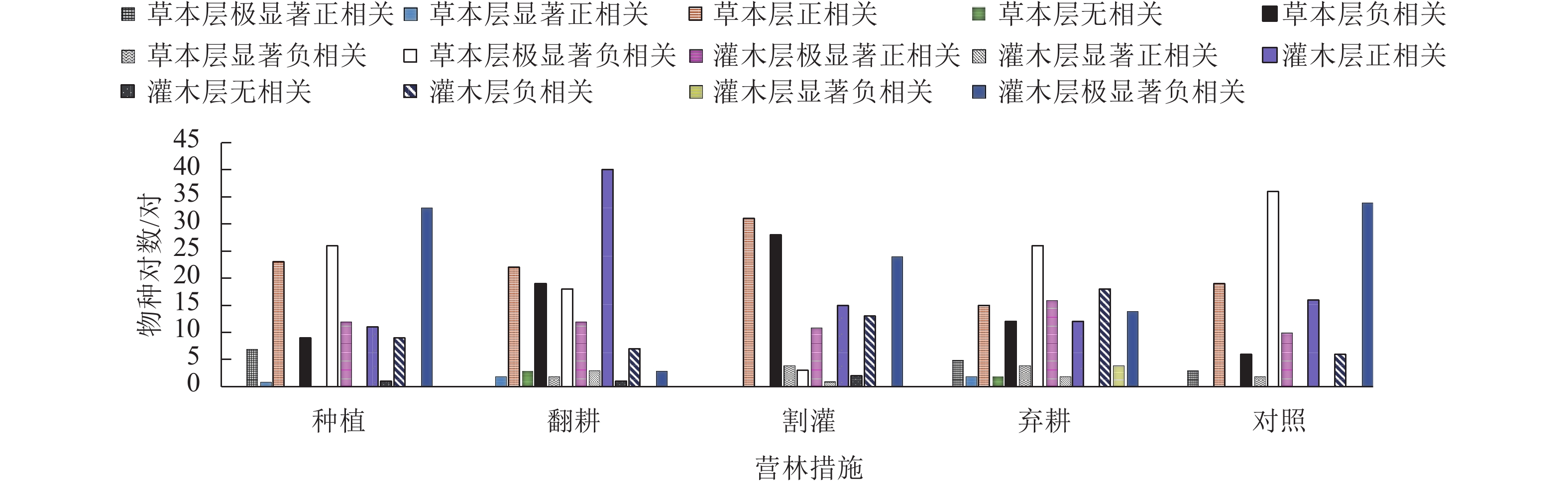 2检验、联结系数、Spearman秩相关系数、M. Godron稳定性等测度,比较不同营林措施(种植、翻耕、割灌、弃耕、对照)对高速路域加杨人工林林下植物种间关联和群落稳定性的影响。