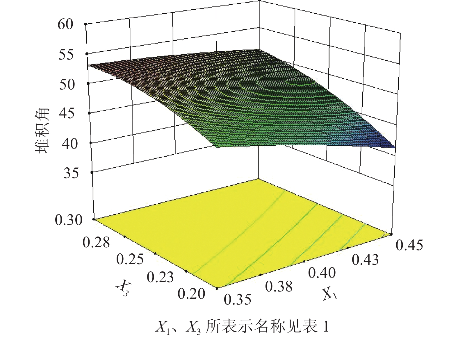 Phyllostachys edulis粉末物理堆积角实验结果,采用离散元法(DEM)模拟仿真和实验设计(DOE)相结合的方法,通过Plackett-Burman (P-BD)实验、爬坡实验和响应面实验获得竹粉堆积角和仿真参数之间的二次多项式回归模型,以物理堆积角为目标值预测得到接触参数的最优组合。