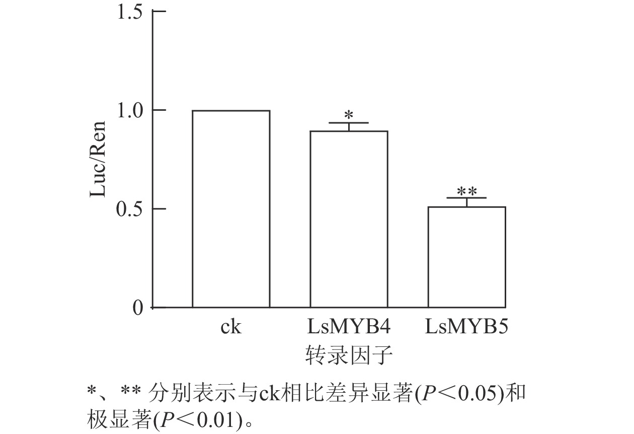 LsUFGT1启动子区域具有启动子活性。④ 双荧光素酶报告实验发现LsMYB4和LsMYB5能够显著抑制