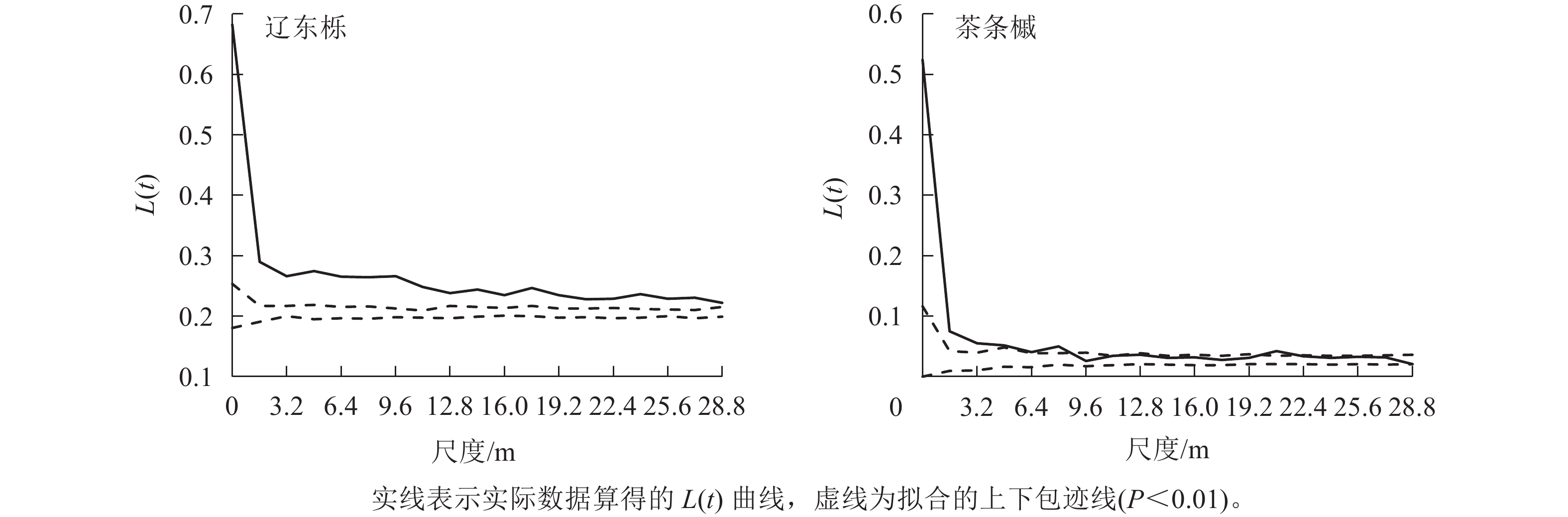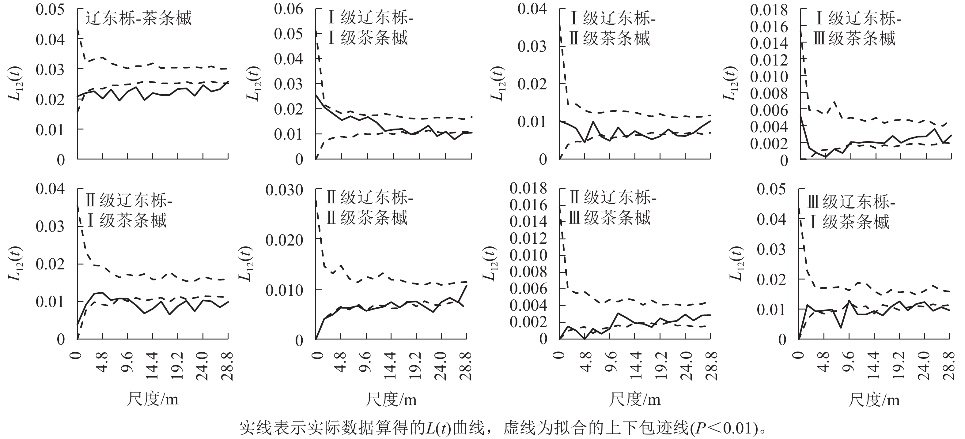 Acer ginnala为主要优势种,其径级结构均呈倒“J”型,为增长型,种群结构稳定、更新良好。在研究尺度内辽东栎种群呈聚集分布,茶条槭种群则表现为小尺度聚集分布,大尺度随机分布的格局。2个优势种群的小径级个体在小尺度上以聚集分布为主,大径级个体为随机分布格局。辽东栎种群种内关联性仅在中小径级林木间表现为正关联,且径级差距越小,正关联的程度和空间尺度范围越大,茶条槭种群仅在小尺度的Ⅰ级和Ⅱ级林木间表现为正关联。随尺度增加,优势种群间总体关联性由无关联转变为负关联再转变为无关联,不同径级种群间的空间关联性仅出现在中小径级林木间,且为负关联。