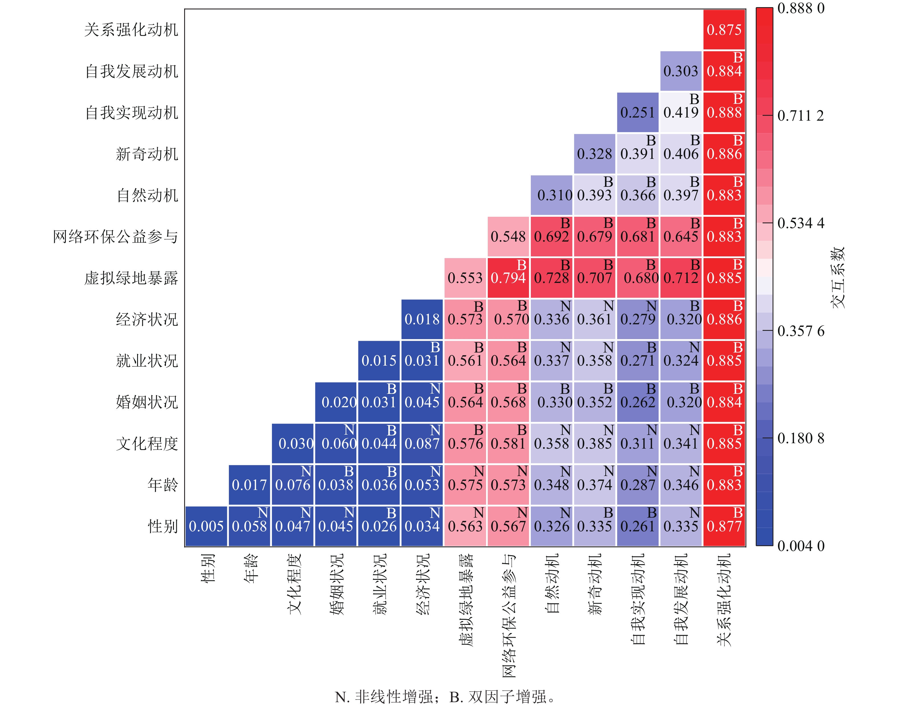 结果①动机因子对健康效益感知的解释力显著高于个人属性,关系强化动机作用最强,其次为虚拟绿地暴露与网络环保公益参与;②动机与健康效益呈非线性关联,新奇动机、自我实现动机等呈倒“U”型曲线,自然动机与关系强化动机呈线性关系;③个人属性中,性别、年龄等虽独立影响弱,但与动机交互后产生非线性增强效应。