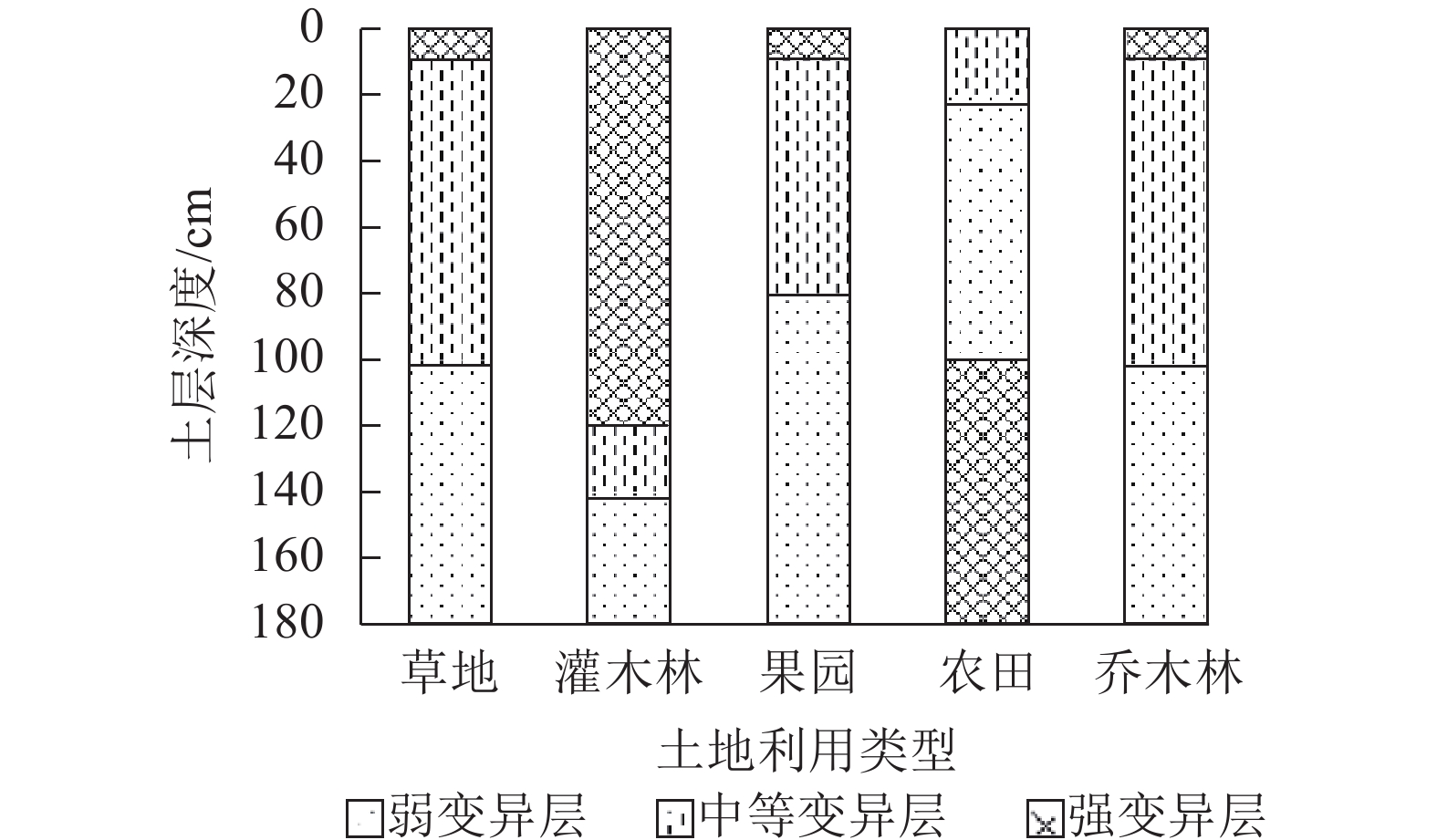 P<0.05)。不同土地利用类型土壤水分从高到低依次为农田(21.06%)、灌木林(17.88%)、草地(15.17%)、果园(15.02%)、乔木林(13.29%)。土壤水分垂直变化表现出一定的层次性。将各土地利用类型土层水分垂直层次划分为强变异层、中等变异层以及弱变异层。草地和乔木林地的垂直层次一致,强变异层为0~10 cm土层,中等变异层为10~100 cm土层,弱变异层为100~180 cm土层。灌木林强变异层以及中等变异层为0~140 cm土层,深度范围大于其他土地利用类型。果园强变异层以及中等变异层为0~80 cm土层,深度范围低于其他土地利用类型。农田土壤水分垂直变异不同于其他土地利用类型,100~180 cm土层变异性最强,中等变异层为0~20 cm土层,弱变异层为20~100 cm土层。