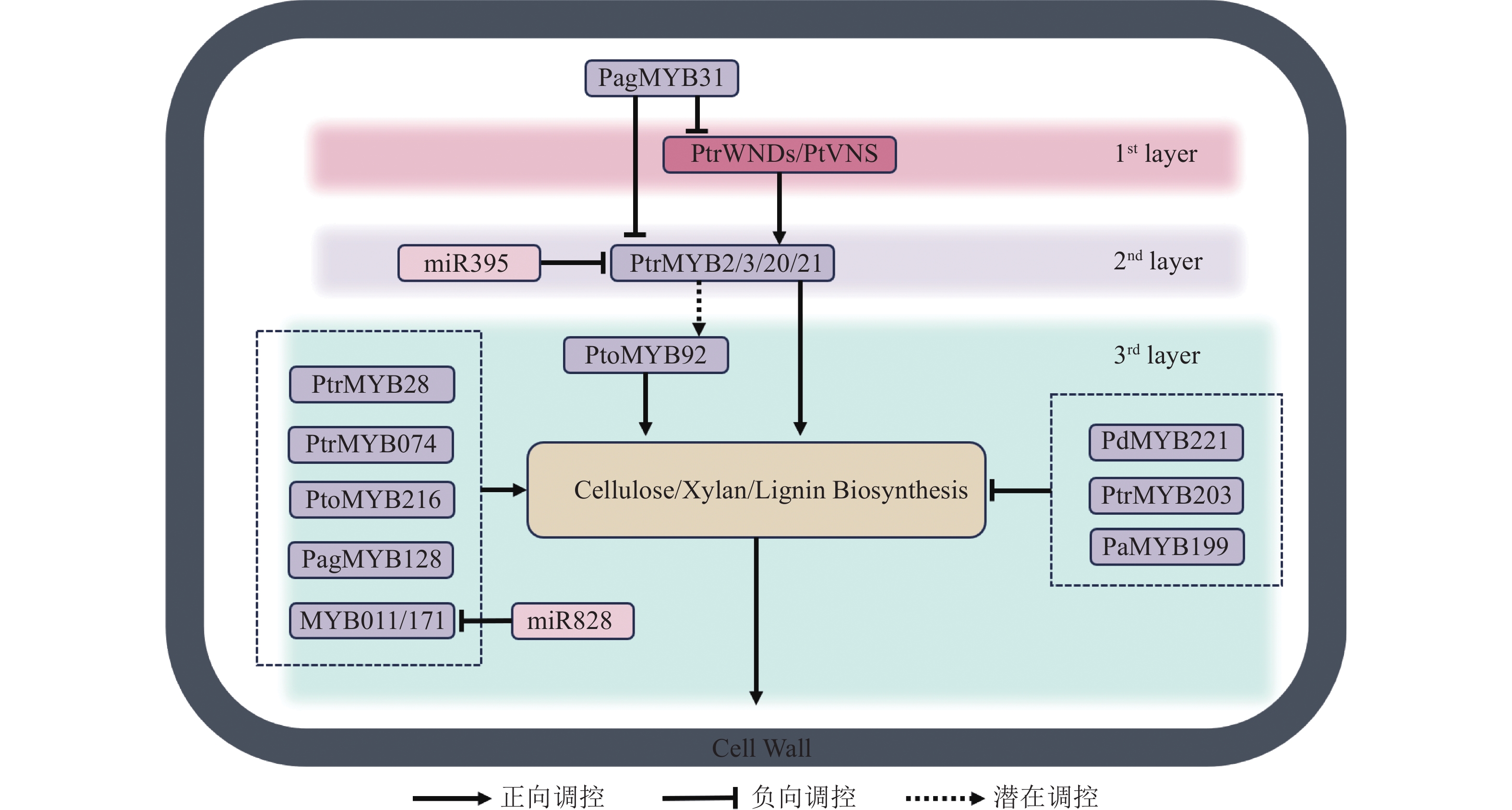 植物的次生细胞壁对维持结构完整性、提供机械支撑以及促进水分和矿物运输具有关键作用。随着分子生物学和生物信息学的发展,次生细胞壁形成的分子调控机制被深入揭示。研究显示:转录因子(如NAC、MYB等)和微RNA(microRNA)构建起了多层次的调控网络,在次生细胞壁的形成过程中发挥了重要作用。其中,NAC和MYB家族转录因子能激活木质素、纤维素和木聚糖合成相关的基因,从而直接参与次生细胞壁的生物合成;microRNA则通过靶向这些转录因子及其下游基因,实现对次生细胞壁发育的精细调控。本研究综述了次生细胞壁形成的最新研究进展,重点探讨了转录因子和microRNA在该过程中的相互作用及调控机制。此外,还对该领域当前的研究挑战和未来方向进行了探讨,为加深对植物木质部发育分子基础的理解以及为木材改良和生物质能源开发提供理论支撑。图1表2参87