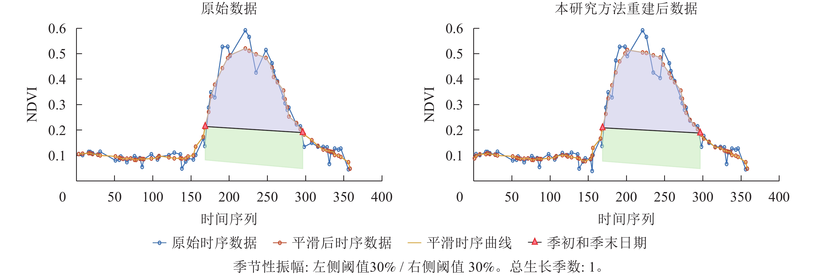 结果①在影像的超分辨率重建方面,基于本研究提出的方法,结构相似性指数(structural similarity,SSIM)和峰值信噪比(peak signal to noise ratio, PSNR)分别达0.834和28.69,相较于目前的主流方法可以更好地重建异源遥感数据;②时序重建后,2个样地的遥感影像的重访周期分别由6.40、6.63 d降至5.70、5.88 d,空间分辨率提升至10 m;③4种平滑方法的物候提取结果,与原始数据提取结果相比具有一定的差异性,优于目前广泛用于时序填补的基于插值的方法。