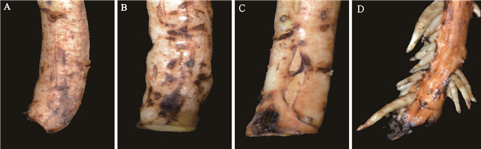 • 扦插后3 d,插穗基部部分表皮褐化(图 1A);扦插后5 d,试验组部分插穗基部膨大,个别皮孔有外凸甚至开裂迹象(图 1B);扦插后7 d至9 d,试验组插穗基部膨大,切口附近沿茎开裂,开口处有白色絮状组织,不定根开始发生(图 1C);扦插至15 d时,不定根突破表皮,开始伸长生长(图 1D)。对照组插穗扦插至15 d时,插穗基部表皮褐化,未生根。
