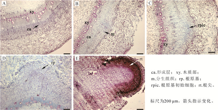 • 相比于对照,经IBA诱导的嫩枝插穗基部组织结构变化明显。图 2为试验组插穗基部横切片,可以发现扦插后3 d,插穗基部形成层开始迅速分裂,并明显增厚(图 2A);扦插后5 d,部分增厚的形成层细胞进一步发育,在韧皮部形成团状的分生组织(图 2B);扦插至7 d时,根原基分生组织进一步分裂分化成初始根原基细胞(图 2C),扦插至9 d时,初始根原基细胞在韧皮部发育为圆顶状的根原基(图 2D);至扦插15 d时,不定根形成并突破表皮(图 2E)。