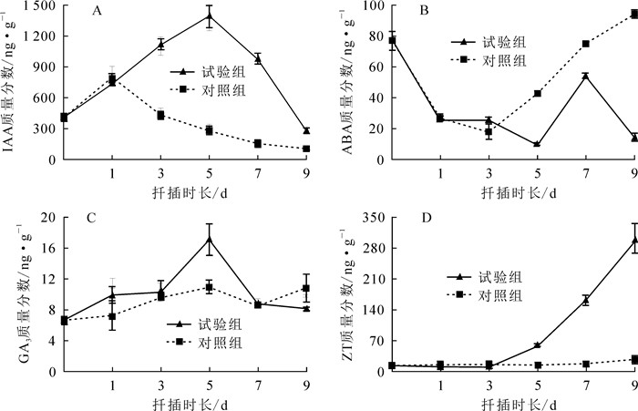 • ZT质量分数的变化图 3D所示。扦插后3 d,试验组和对照组内源ZT质量分数变化不明显;3 d后试验组ZT质量分数开始上升,9 d时达到298.5 ng·g-1,而对照组一直无明显变化,只在7 d后略微升高,9 d时仅达到30.9 ng·g-1