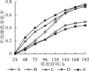Biolog生态板板孔平均颜色变化率(AWCD)反映了土壤微生物利用单一碳源的能力, 是土壤微生物活性及群落功能多样性的重要指标[24], 计算不同植被类型土壤AWCD值的3次重复平均值, 绘制AWCD值随时间动态变化曲线(图 1)。结果显示:随着时间的增加, AWCD值不断增加, 表明土壤微生物对31种碳源的综合利用随时间逐渐增加。从图 1可以看出:AWCD值变化曲线在144 h时有明显的变化, 培养24~144 h时间内, AWCD值上升较快, 表明微生物对碳源的利用速率较快。144 h后, AWCD值上升速率明显降低且趋于平缓, 微生物对碳源的利用逐渐达到平衡甚至减弱。培养24~144 h时间内, 5个样地杉木人工林土壤微生物对31种碳源的综合利用程度从大到小依次为样地D、样地C、样地B、样地A、样地E。从土壤微生物对碳源的综合利用情况可以看出:林分密度适中时, 微生物利用碳源的能力较强, 且利用程度显著(P<0.05)大于高密度和低密度林分。
