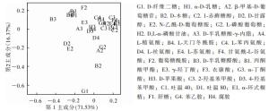 对不同密度杉木人工林生态板培养96 h的AWCD值表征的微生物利用单一碳源特性进行主成分分。根据主成分提取原则[25], 提取与土壤微生物碳源利用功能多样性相关的2个主成分累计贡献率达到87.90%。其中第1主成分的方差贡献率为71.53%, 第2主成分的方差贡献率为16.37%, 因其他主成分的方差贡献率较小, 故只分析第1主成分和第2主成分(图 3)。由各孔AWCD值贡献率得分, 第1主成分得分为正的共有17种, 得分最高的为α-D-乳糖(α-D-lactose), 其中碳水化合物类6种, 氨基酸类4种, 羧酸类2种, 多聚物2种, 胺类2种, 酚类1种。第2主成分得分为正的共有21种, 其中碳水化合物类3种, 氨基酸类4种, 羧酸类7种, 多聚物4种, 胺类2种, 酚类1种。由此说明:对杉木人工林土壤微生物利用的碳源贡献率种类最多的是碳水化合物类, 其次是氨基酸类。