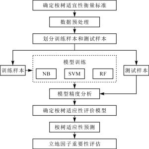 基于朴素贝叶斯算法、支持向量机算法、随机森林算法3种算法构建的模型拟合精度分别为63.18%、69.73%和78.03%,泛化精度分别为64.33%、67.93%和78.18%;相较于朴素贝叶斯、支持向量机算法,随机森林算法对缺失数据不敏感,在训练的过程中能检测到特征与特征之间的互相影响,模型泛化能力强,具有更高的预测精度,在本研究中分类效果最好。缺少特征独立性假设和立地因子数据是朴素贝叶斯算法分类效果差的原因;而缺少通用的解决方案,对缺失数据敏感,受核函数的影响较大等导致了支持向量机算法分类效果欠理想。本研究采用的多模型对比为以后其他树种适宜性研究选取模型提供了参考。