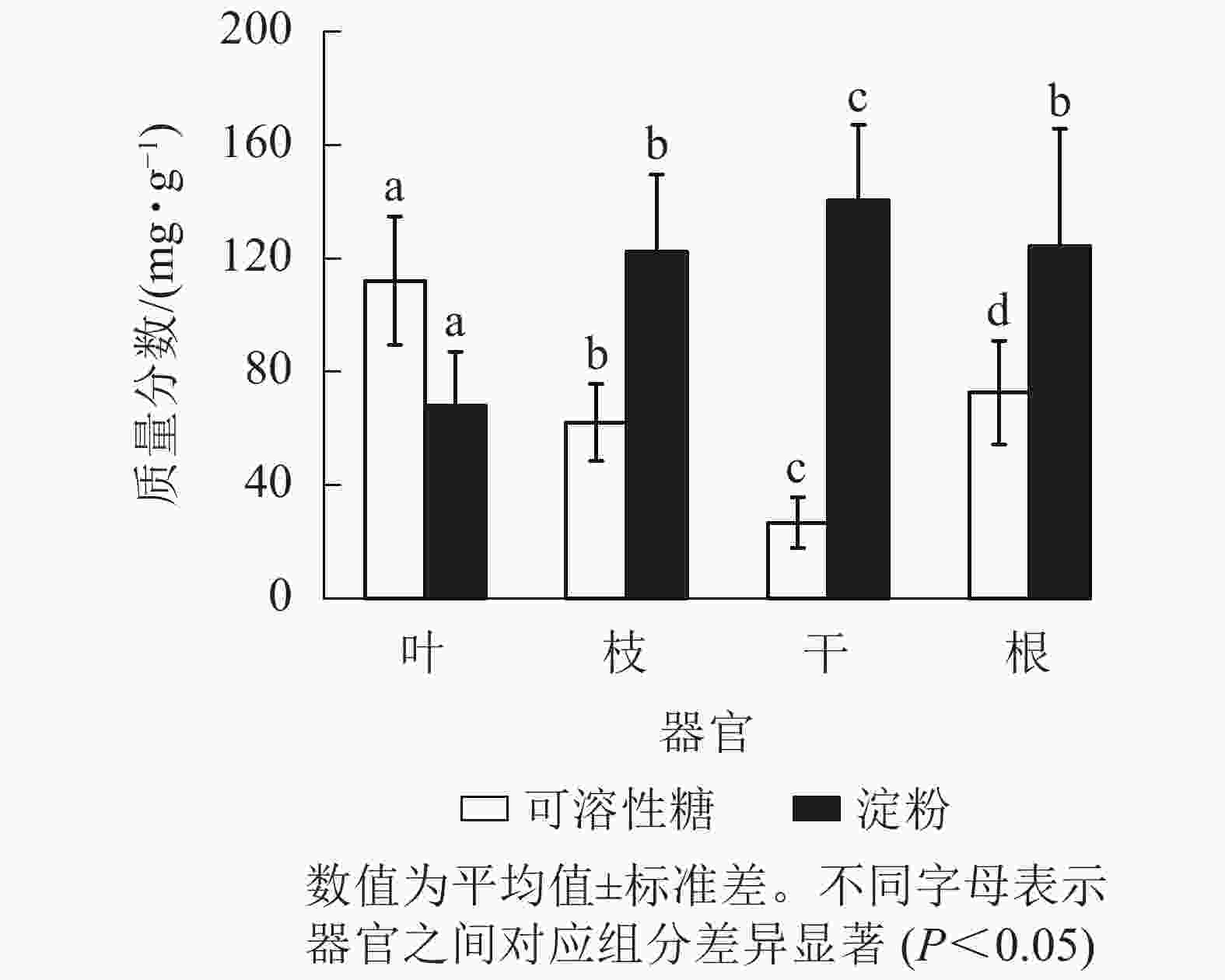 植物通过光合作用固定大气中的碳并产生碳水化合物,不同的碳水化合物在植物生长发育过程中的作用不同[1]。结构性碳水化合物(SC)主要用于植物的结构组织构建,非结构性碳水化合物(NSC)参与植物的生理代谢和渗透调节等过程,是植物进行生理调节的物质基础[2]。葡萄糖、果糖和蔗糖等可溶性糖及淀粉,是NSC的主要组成部分[3]。植物利用可溶性糖调节自身生理状态,同时将部分碳水化合物合成淀粉作为储能物质。当植物面临碳资源不足时,可将淀粉再活化形成可溶性糖以及时补充碳资源[4]。植物体内的NSC水平受生物和环境因素影响较大,土壤水分、气温、光照、损伤、常绿树种的叶龄以及植物自身休眠与否等[5-6]都在不同程度上调控着植物体内的NSC水平[7-8]。除此之外,所有影响植物生长的因素也都会改变NSC在不同器官间的分配格局。NSC及其组分的含量水平是植物在不同生长阶段中碳收支平衡的体现,反映了植物的生长状态和碳代谢差异[9],因此对树木中NSC进行探究是研究树木适应性和固碳潜力的关键。