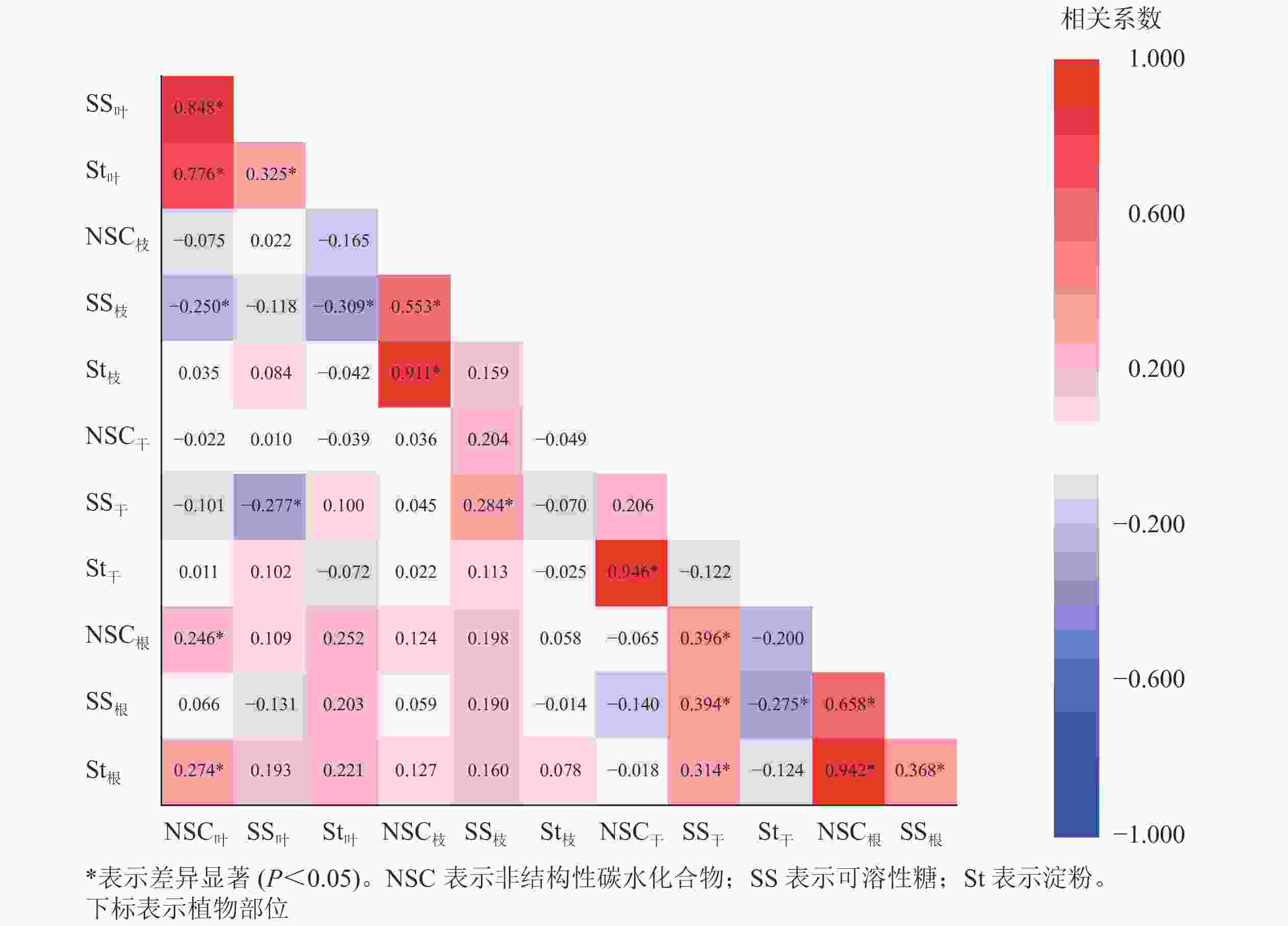 从图2可见:养分利用的就近原则使NSC及组分质量分数的显著相关关系主要发生在相邻器官之间。枝中可溶性糖分别与叶的NSC和淀粉呈显著负相关关系(P<0.05);树干可溶性糖与根的NSC及各组分均为显著正相关(P<0.05)。器官内部(叶、根)对碳资源的利用与储存则主要表现为显著正相关(P<0.05),体现了NSC及组分在不同器官间以及器官内调节与分配关系的多样性。