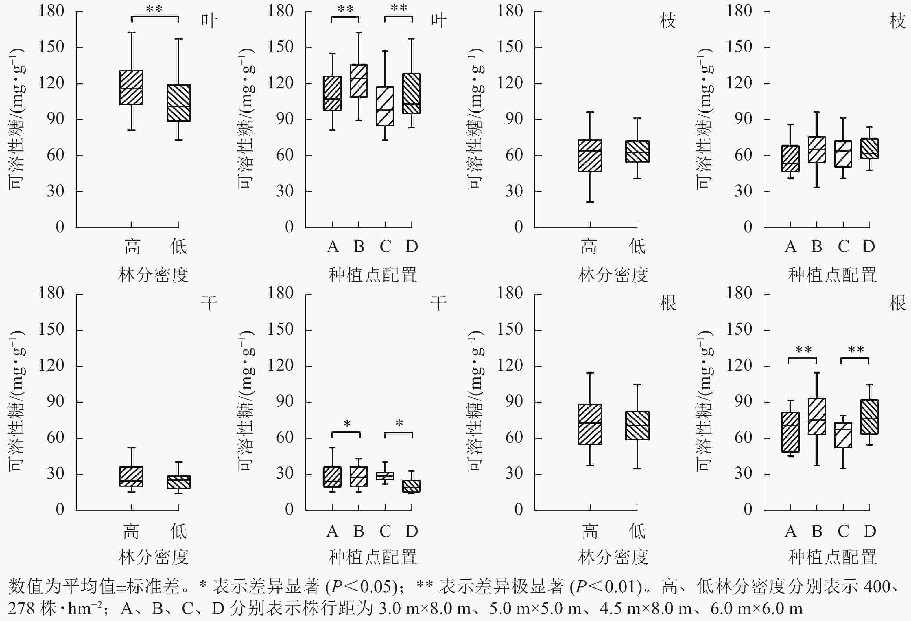 从图3可见:林分密度对不同器官中可溶性糖质量分数的影响存在差异。不同林分密度下杨树叶中可溶性糖质量分数差异极显著(P<0.01),枝、干和根中可溶性糖质量分数则不受林分密度影响。种植点配置对可溶性糖质量分数的影响因器官而异,不同配置下杨树叶、根中的可溶性糖质量分数差异极显著(P<0.01),树干中可溶性糖质量分数差异显著(P<0.05),枝中可溶性糖质量分数在不同配置间差异不显著。