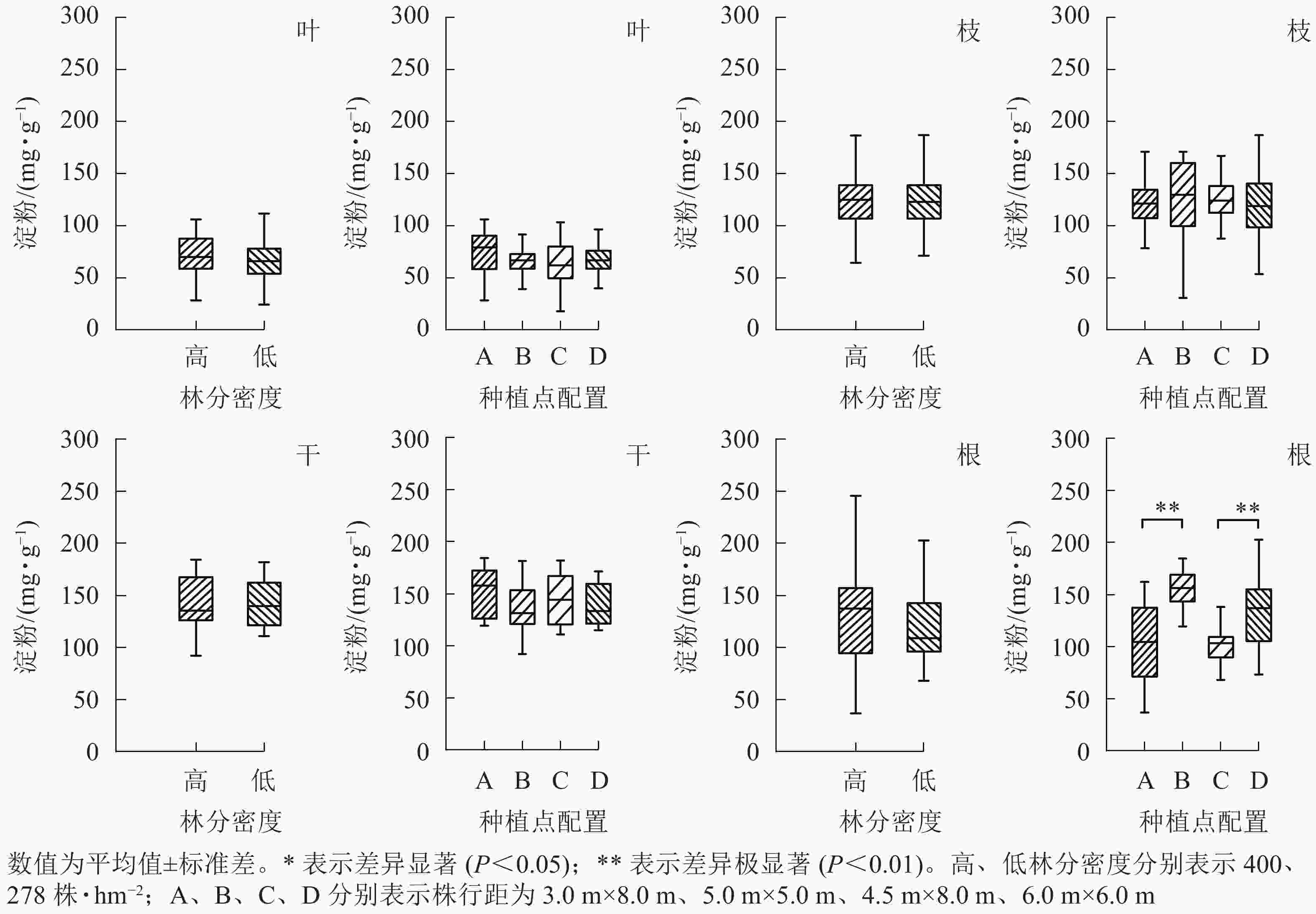 从图4可见:杨树地上部分各器官中淀粉质量分数均不受林分密度和种植点配置的影响。林分密度对地下部分(根)的淀粉影响也不显著,然而不同种植点配置对杨树根中淀粉质量分数的影响差异极显著(P<0.01)。高密度下,正方形配置的杨树根中淀粉质量分数极显著高于长方形配置(P<0.01);与之相似,低密度林分条件下正方形配置的杨树根中淀粉同样极显著高于长方形配置(P<0.01)。
