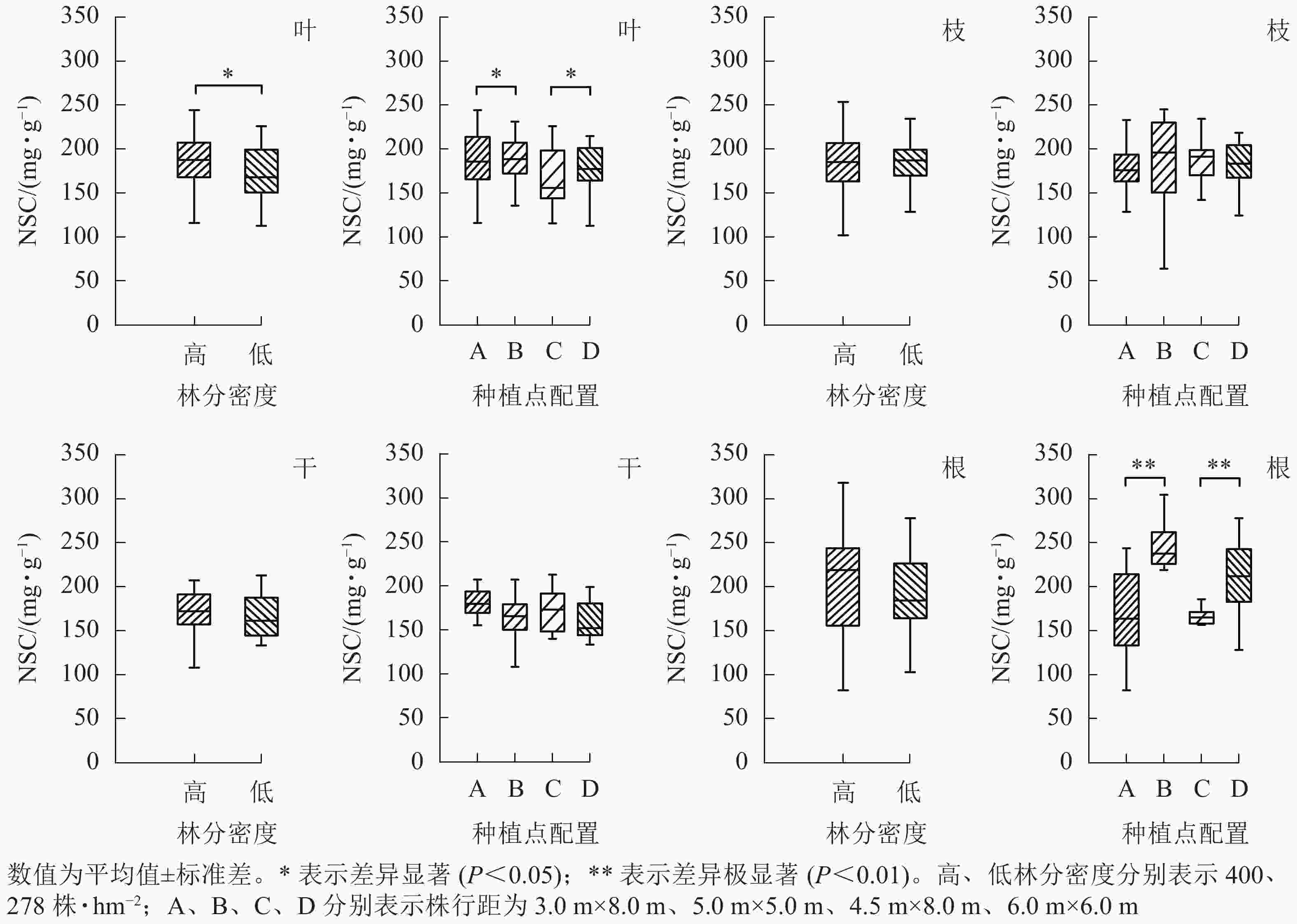 从图5可见:杨树叶中NSC质量分数在不同林分密度间差异显著(P<0.05),其他器官中NSC质量分数受林分密度影响差异不显著,高密度林分的杨树叶中NSC质量分数显著高于低密度林分。叶中NSC质量分数受种植点配置的影响显著(P<0.05),根中NSC质量分数受种植点配置的影响极显著(P<0.01),其他器官中NSC质量分数在不同林分密度和种植点配置下差异不显著。整体上,相同林分密度的杨树叶和根中NSC质量分数均表现为对应的正方形配置大于长方形配置。