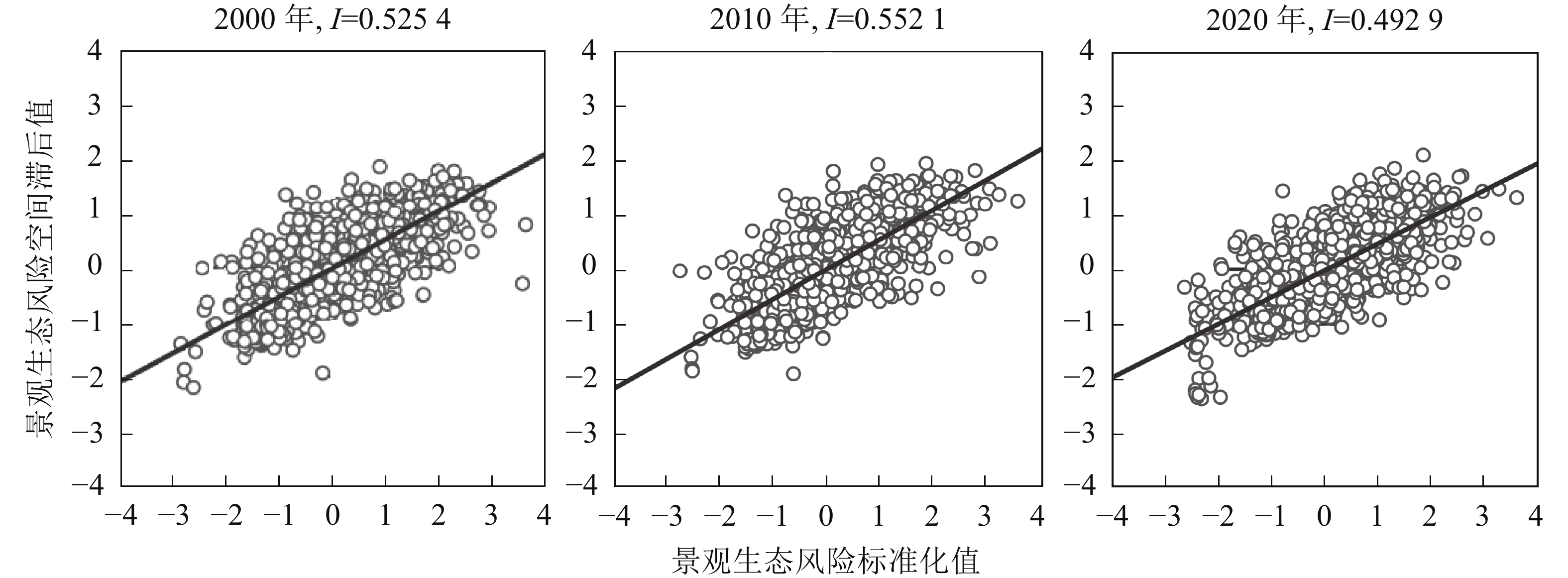 • 图1可知:安宁市2000、2010和2020年景观生态风险的莫兰指数(I)分别为0.525 4、0.552 1和0.492 9,均表现出显著的空间正自相关性(P<0.01),说明景观生态风险值在空间上表现为聚集分布,且相互之间存在影响。2000—2010年,景观生态风险的I值上升,2010—2020年下降,整体呈下降趋势,表明安宁市景观生态风险值在空间分布上的依赖性减弱,空间趋同性逐渐降低,人类活动影响着生态风险指数的空间格局,并导致其空间分布由聚集向均匀过渡。