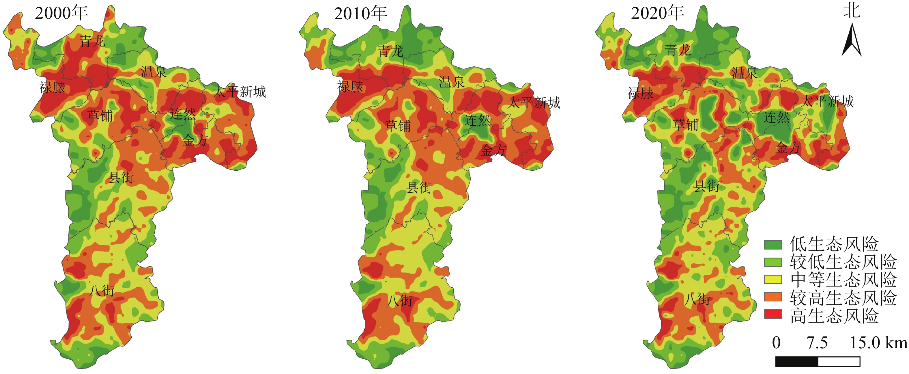 • 表2可知:2000—2020年安宁市景观生态风险整体以中等风险和较高风险区为主,占研究区景观生态风险等级总面积的52.95%~59.76%。结合图2来看,低生态风险区主要分布在研究区南北两端以及中西部山地地带,景观类型主要为林地、草地,人为干扰较少,景观损失度较低;研究期内面积总体上升,主要为青龙、连然、金方、太平新城等街道组成的中心城区的低生态风险面积增加。这是由于青龙街道在此期间建成国家园林城镇,林地等景观面积增加,生态环境改善;随着城镇化的推进,中心城区城镇拓展有序,人造地表景观集中成片,稳定性强,外界干预影响较少。此外,县街和草铺街道作为安宁市重要的工业基地,为打造绿色工业城市的景观风貌,建设了麒麟现代工业景观分区和职业教育景观风貌分区,景观斑块的连接度增强,景观生态风险得到有效防控,低生态风险区面积增加。较低生态风险区面积持续上升,主要分布在低生态风险区的周围。中生态风险区主要分布于八街和县街街道,以及其余各街道耕地景观周边;该区以耕地景观为主,多分布于山地丘陵地带,景观形态复杂,水网密布,林地、草地、灌木地和人造地表景观等相互交错,破碎化程度较高,生态风险加剧,但研究期内该区整体面积变化相对稳定。较高生态风险区分布较为广泛,主要分布于高生态风险区向中等生态风险区过渡区域,研究期内面积占比降低,共降低6.94%。高生态风险区主要分布于各街道城镇扩展的边缘地带,研究期内总面积呈下降趋势,各时期占比分别为15.28%、14.47%、10.64%;说明城镇快速扩张对各类景观类型干扰度较大,尤其在城市边缘地带建设用地较为分散,人文景观与自然景观交替频繁,打断了生态系统的整体,使得景观破碎度高、分离度明显上升,加大了生态风险;其中禄脿街道整体处于高生态风险等级,作为集磷矿工业、特色农业、交通枢纽、特色农业等多种功能的混合街道,景观破碎度和分离度大,高生态风险区面积较多且呈现长期稳定的高风险状态。应用转移矩阵进一步分析研究区景观生态风险各等级间的转移特征,根据表3可以看出:2000—2020年,较低生态风险区主要转移为低生态风险区,中等风险区主要转移为较低、低生态风险区,较高生态风险区主要转移为中等生态风险区,高生态风险区主要转移为较高生态风险区。各等级生态风险区均主要表现为向次级生态风险区转移的特征。由此可以看出,研究区整体生态安全保障水平有所提高,城市经济发展与环境保护逐渐向着良性发展的态势转变。
