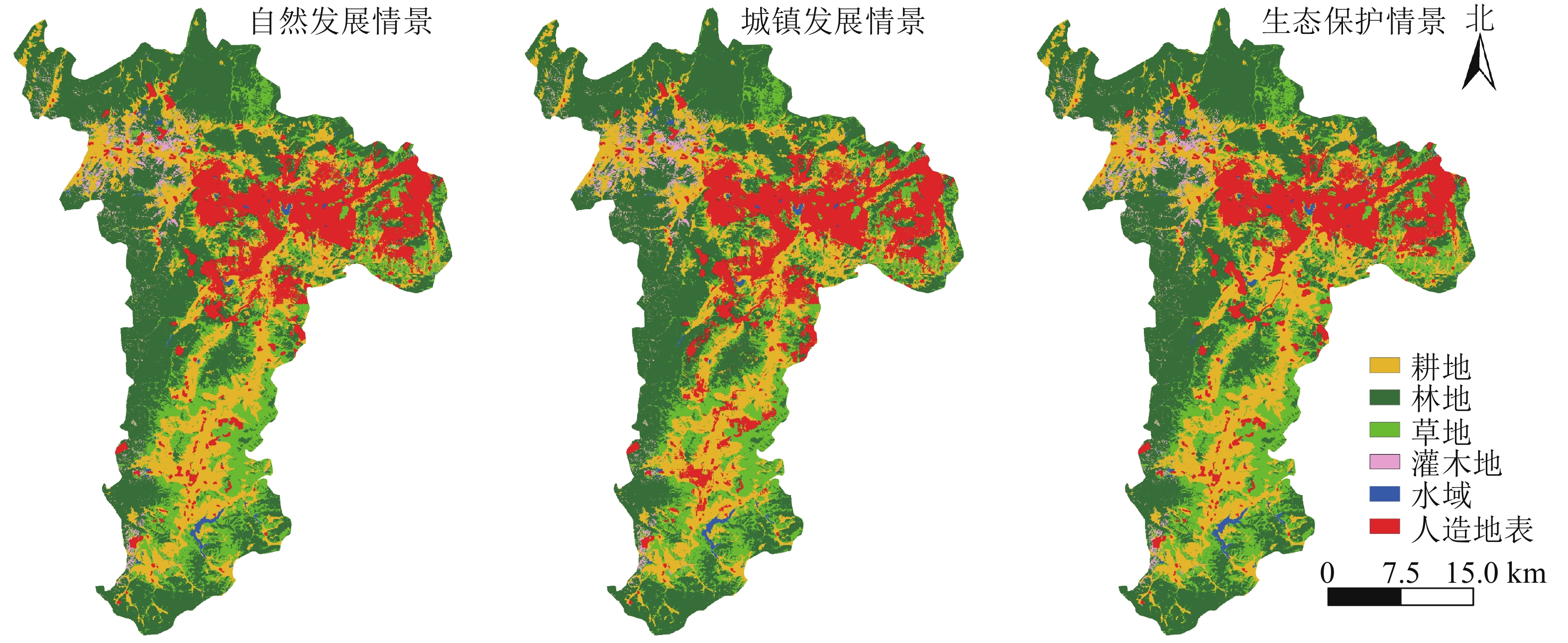 • 为验证PLUS模型对景观类型模拟结果的可靠性,本研究以2010年土地覆被数据为基础,结合各景观类型发展概率,并设置相关参数,得到2020年景观类型空间格局模拟结果,并与2020年景观类型现状进行对比,精度验证计算求得总体精度为89.84%,Kappa系数为0.856,FOM值为0.247,表明模型具有较高的可信度,故基于PLUS模型对安宁市未来景观类型变化进行模拟预测。依据安宁市历史年份的景观类型变化特征,利用Markov模型构建3种不同情景下安宁市2030年景观类型。其中自然发展情景以2020年景观类型现状数据为基础,预测2030年各景观类型的面积及空间分布情况;考虑安宁市正处于快速发展的重大战略机遇期,云南石化治理、滇中新区建设等相关政策进一步推进,势必带来建设用地的快速增长,因此城镇发展情景将耕地、林地、草地、灌木地向人造地表的转移概率增加20%,人造地表向除耕地外的其他景观类型转移概率降低30%;考虑安宁市是长江上游生态安全格局的重要组成部分,为了进一步打造全国“工业城市中生态最好,生态城市中工业最强”城市,未来的景观类型变化中要进一步加强对生态用地的保护,在生态保护情景设置中,将耕地、林地向人造地表的转移概率降低30%,草地、灌木地、水域向人造地表的转换概率降低20%,人造地表向林地的转移概率增加10%,并严禁生境退化,将区域各个水库、湖泊作为约束条件,限制其任意转换。
