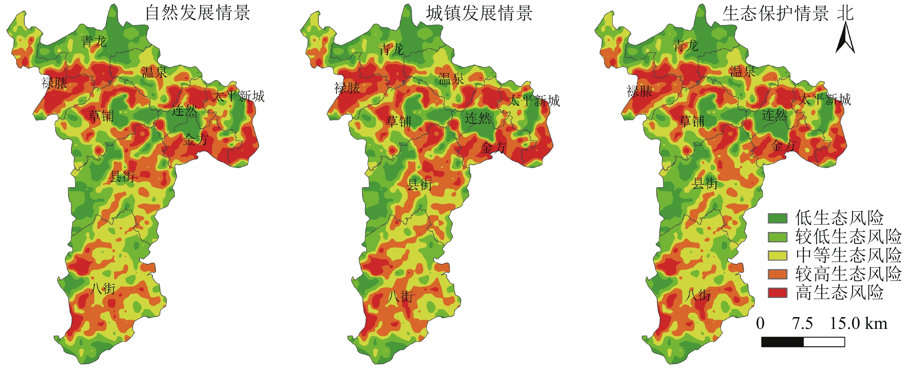 • 图4可知:2030年3种情景下安宁市景观生态风险空间分布与2020年相似,整体上仍以中等生态风险区、较高生态风险区为主,但高生态风险区和低生态风险区面积均有上升。与2020年相比,自然发展情景下的较低、中等及较高生态风险区面积有所下降,而高生态风险区的面积增长幅度较大(表5),增加了2 436.66 hm2,低生态风险区也有一定的增加,扩大了1 227.79 hm2。城镇发展情景下,较低生态风险区、较高生态风险区面积下降,较高生态风险区和高生态风险区面积均得到扩张,分别增大2 189.08和2 779.71 hm2;相比其他情景,低生态风险区面积最小,较高、高生态风险区面积最大。这是由于按照现有发展趋势,建设用地面积将会进一步提高,各景观类型均发生变化,人造地表持续外延式扩张,侵占周边耕地、林地等生态景观,各景观的连通性、稳定性下降,导致较高、高生态风险面积增加。生态保护情景下,高生态风险区面积增幅明显下降,低生态风险区显著增加,与其他情景相比,高生态风险区面积最小,景观生态风险等级面积差异显著;主要原因一方面是由于生态保护情景约束了人造地表扩张,减缓了城镇边缘地区景观破碎度、分离度的升高;另一方面该情景设置了水域限制区,保护了水域的稳定性,约束了城镇扩展,增强了新增人造地表空间结构的整合性,进而增强了景观稳定性,使得生态保护区的低生态风险区面积明显上升。