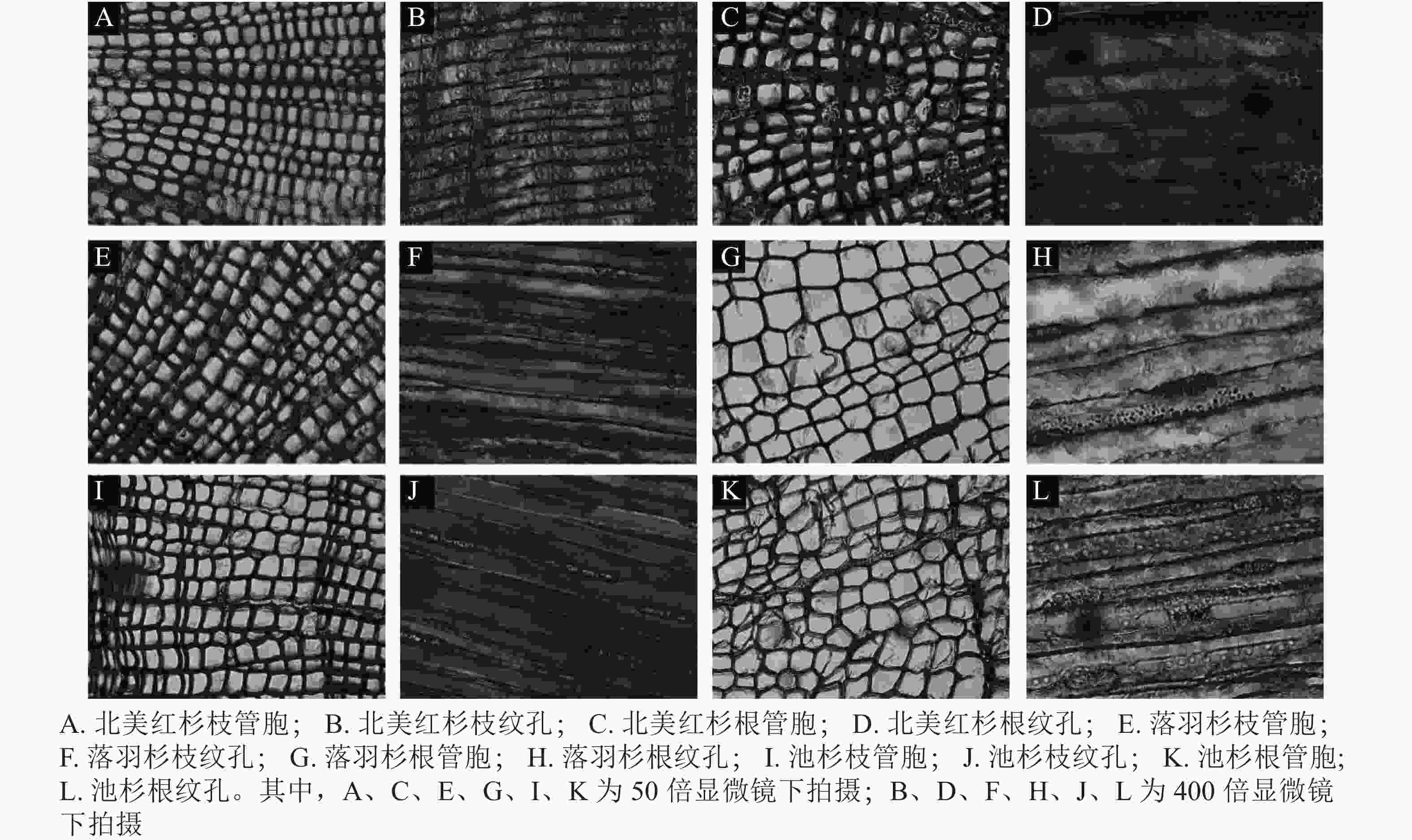 池杉根的纹孔口直径(Ad)显著大于枝(P<0.05,图5A),北美红杉和池杉根的纹孔膜直径(Pd)均显著大于枝(P<0.05,图5B),北美红杉根的Pd显著大于落羽杉和池杉(P<0.05,图5B),北美红杉枝的纹孔开口比(Rap)显著大于根(P<0.05,图5C)。池杉枝的纹孔密度(Npm)显著大于北美红杉和落羽杉,北美红杉和池杉枝的Npm显著大于根,落羽杉和池杉根的Npm显著大于北美红杉(P<0.05,图5D)。