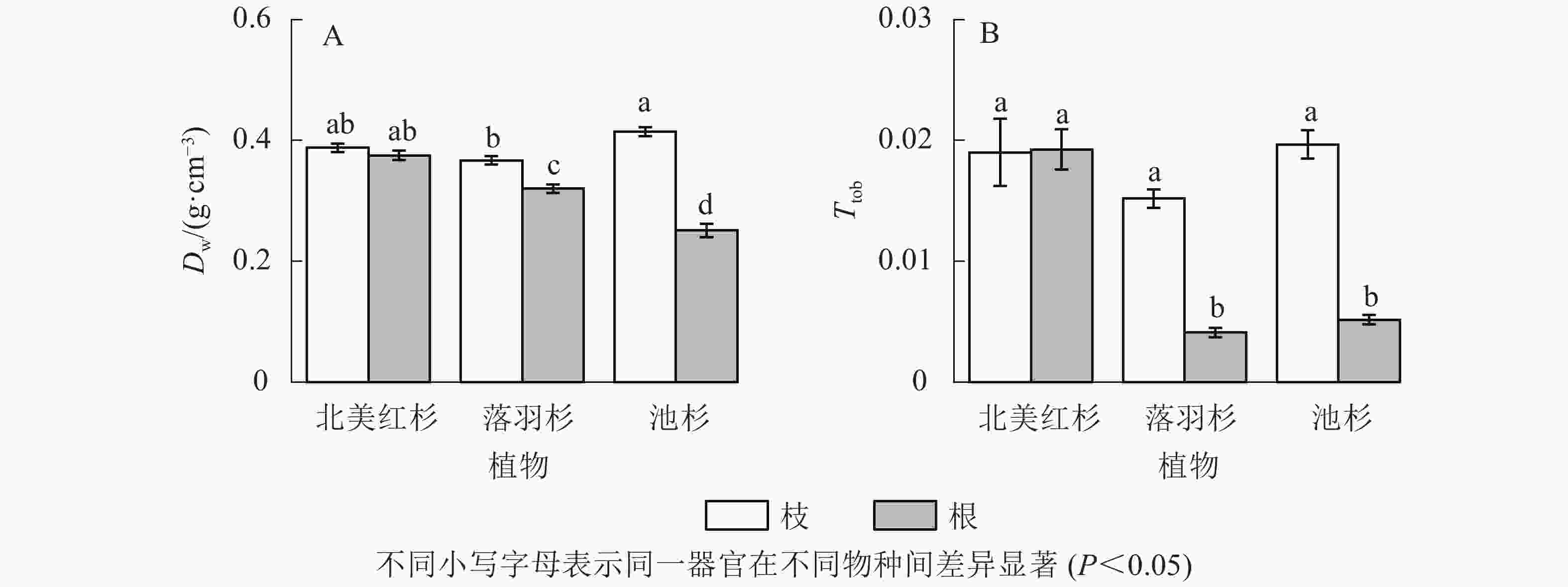 北美红杉枝与根的木质部密度(Dw)和厚度跨度比(Ttob)之间无显著差异(P>0.05),而落羽杉和池杉枝的Dw和Ttob均显著高于根(P<0.05,图6A和图6B)。在枝中,池杉枝的Dw最大,其次是北美红杉,落羽杉最低;3种植物枝的Ttob没有显著差异(P>0.05)。而在根中,北美红杉根的Dw最大,其次是落羽杉,池杉最低;北美红杉根的Ttob显著大于落羽杉和池杉(P<0.05),而落羽杉和池杉无显著差异(P>0.05)。