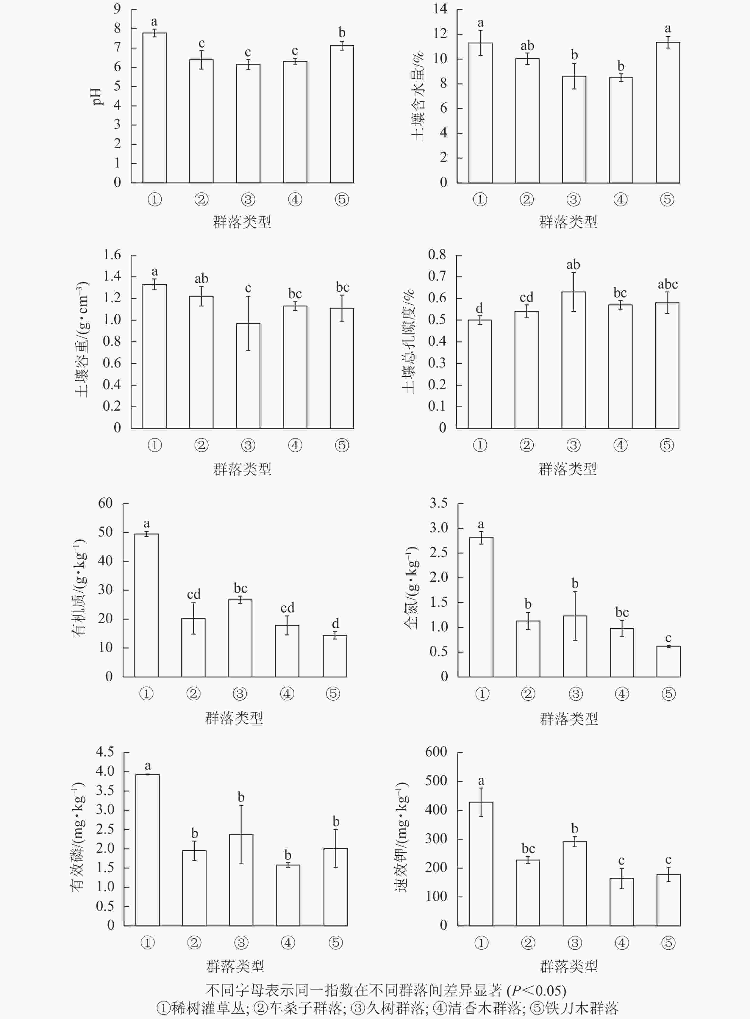 不同植物群落的土壤理化性质存在著显差异(图2),其中久树群落、车桑子群落和清香木群落的土壤pH为6.14~6.39,呈弱酸性,与稀树灌草丛的土壤pH存在显著差异(P<0.05)。久树群落及清香木群落的土壤含水量显著低于稀树灌草丛(P<0.05)。铁刀木群落、久树群落及清香木群落的土壤容重显著低于稀树灌草丛(P<0.05),其土壤总孔隙度显著高于稀树灌草丛(P<0.05)。另外,人工恢复群落的土壤有机质、全氮、有效磷以及速效钾质量分数显著低于稀树灌草丛(P<0.05)。