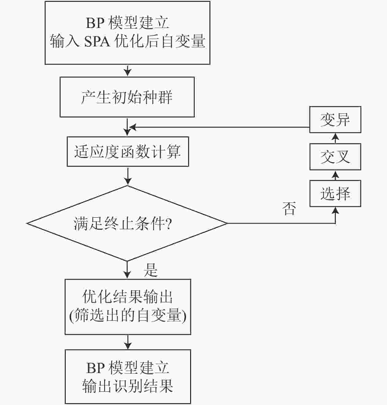目前,近红外光谱分析技术用于木材种类识别大多采用PCA进行特征提取,实现数据降维,但这种方法的特征值筛选有一定的局限性,仅凭累计贡献率决定特征值的个数,无法通过参数化等方法对处理过程进行干预,效率和物理实用性不高。连续投影算法(SPA)是一种常用的特征波长筛选算法。它能够利用向量的投影分析,寻找含有最低限度冗长信息的变量组,通过参数调整可实现较强物理实用性的数据压缩。陈远哲等[8]基于SPA构建了最小偏二乘法回归模型,适用于淡水鱼储藏期质构品质的快速无损检测。郭文川等[9]通过比较不同特征提取方式,得出采用SPA和随机森林识别准确率最高。遗传算法(GA)用于寻优,广泛应用于机器学习等领域。
