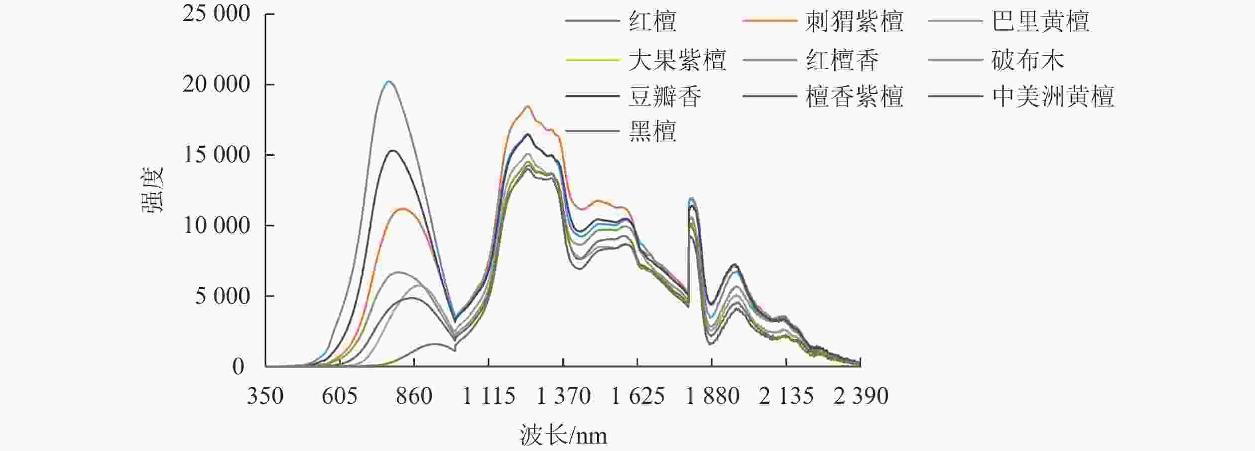 为了更直观地对比10种木材光谱图的差异,分别取10种木材中第1组数据进行绘图分析(图3)。由图3可见:大果紫檀、红檀和檀香紫檀的强度数值过小,几乎与x轴重叠。