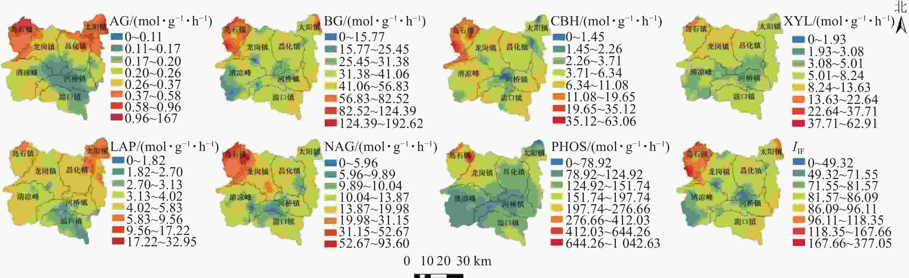 采用全局莫兰指数(Ig)来体现研究区域土壤水解酶的空间自相关水平。使用GeoDa软件对样点构建空间权重矩阵,可以根据局部莫兰指数(IL)绘制局部空间自相关聚类图[18],采用Canoco 5.0对酶活性高、低聚集样点间总体差异采用999次的蒙特卡罗排列检验(Monte Carlo permutation test,999 permutations,full model),然后找出土壤酶活性关系密切的环境因子进行冗余分析(RDA)。