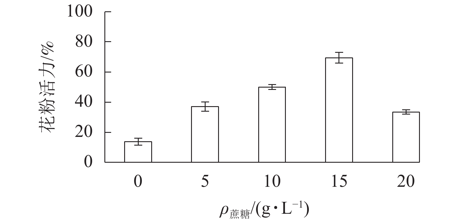 随机采集当天开放花朵的花粉,设置5种蔗糖质量浓度(0、5、10、15、20 g·L−1)处理,于25 ℃下培养6 h后观察并统计花粉萌发率。