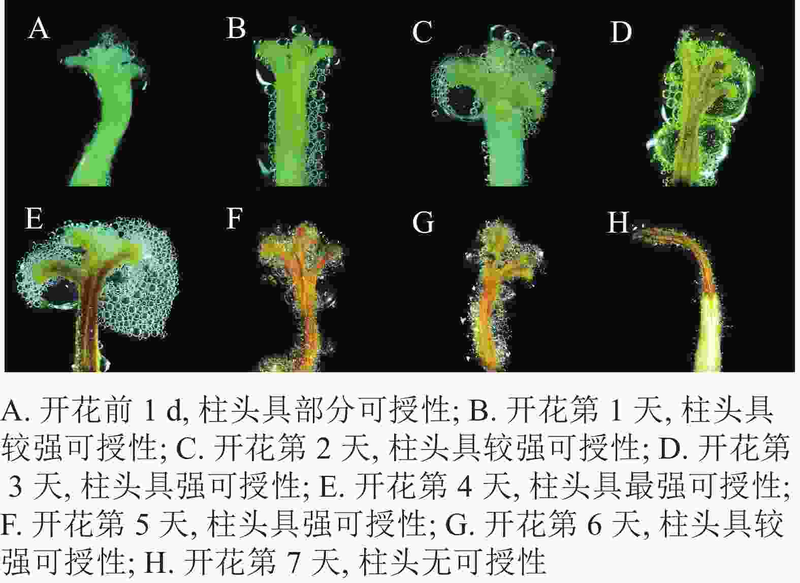 随机选取开放前1 d至开放后7 d的花朵,将柱头放在凹面载玻片上,完全浸泡于质量分数3%的过氧化氢(H2O2)溶液中,30 min后在体式显微镜下观察,若有气泡产生则表明柱头有活性,反之则无[11]。
