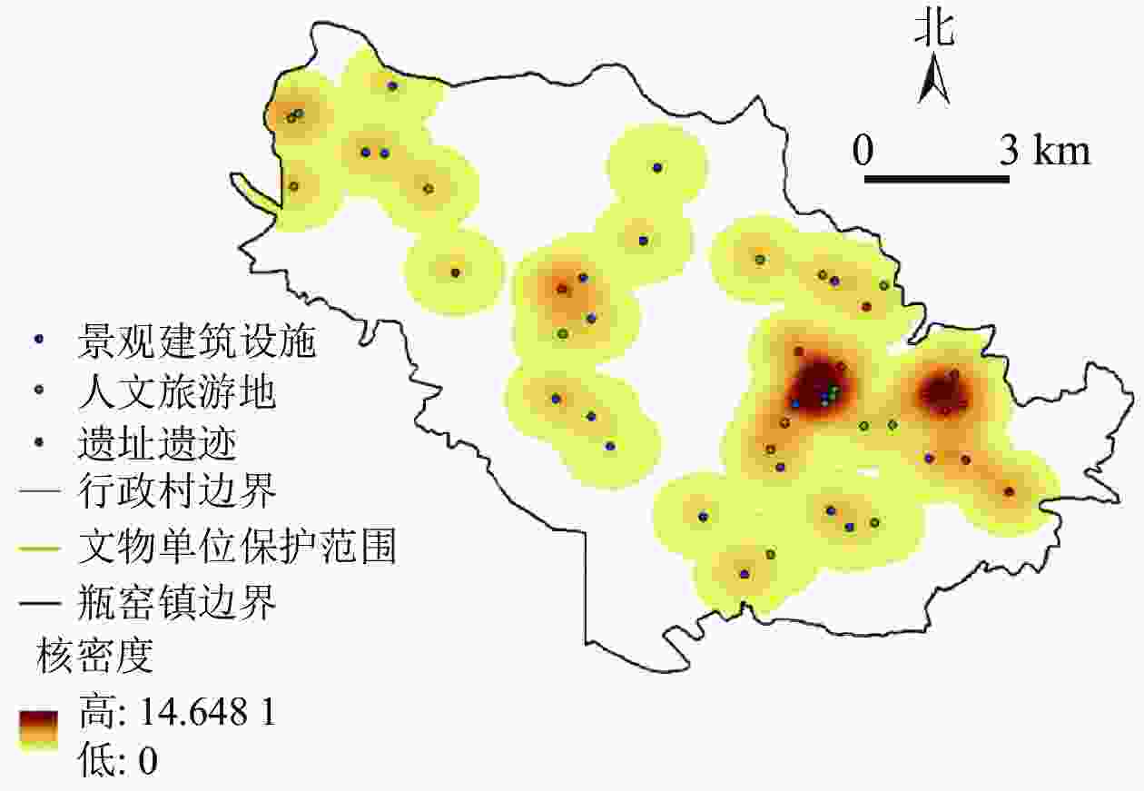 通过对人文景观要素中的遗址遗迹、人文旅游地、景观建筑设施共3种景观进行核密度分析,再将各要素的核密度图进行加权总和,每个要素的权重值默认为1,最终得到人文景观特征空间分析图(图3)。图3表明:瓶窑镇人文底蕴丰厚,文化和建筑设施遗存较多,几乎遍布整个研究区域,瓶窑镇人文景观呈现以良渚文化为内核、多元文化融合的特征。