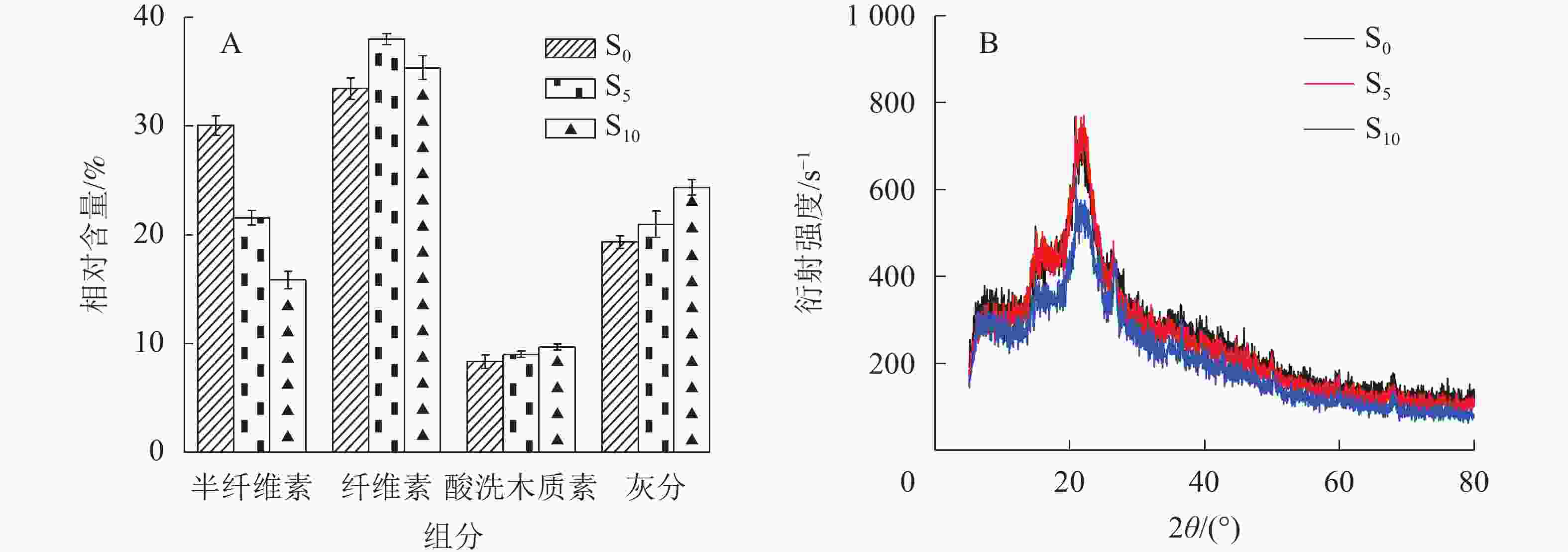 由图1B可知:S0、S5和S10的结晶度分别为43.6%、47.8%和41.4%。在微生物作用下,半纤维素及纤维素不定形区在改性处理前期优先降解,纤维素定形区占比增加,聚合度提高,因此在生物改性处理前期S5的结晶度相比于S0有较大幅度提高。随着生物改性处理时间的延长,半纤维素含量逐渐降低,微生物开始大量分解并消耗纤维素,S10的结晶度因此降低,甚至低于S0,可见生物改性处理10 d后秸秆纤维素定形区部分分解。