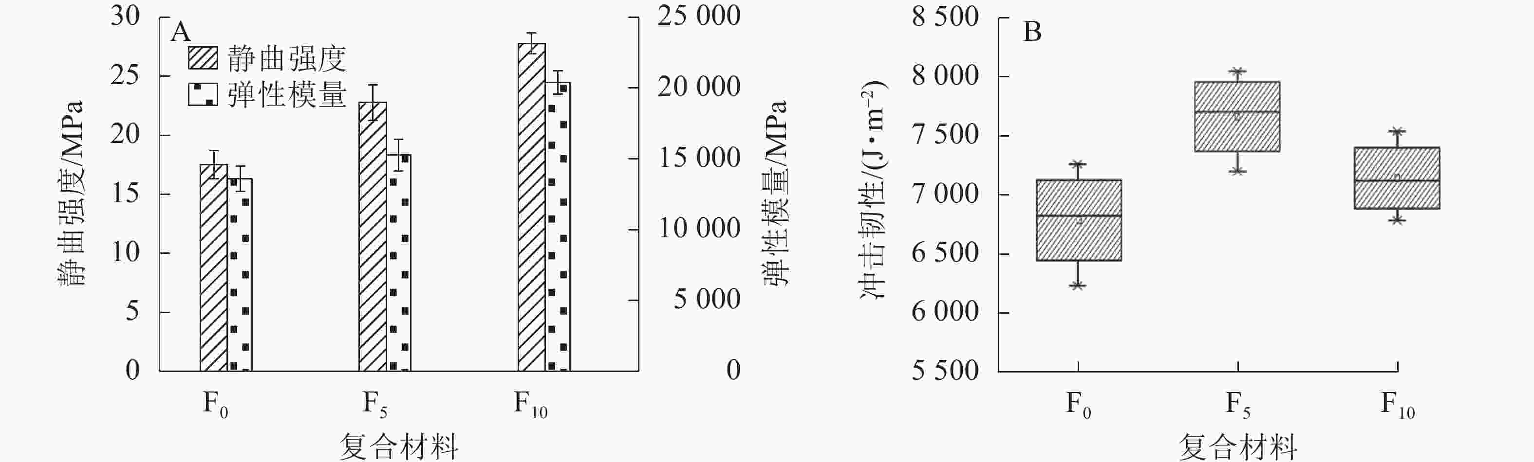 如图4B所示:在不同生物改性处理时长的秸秆纤维制备的复合材料中, F5的冲击韧性更好,平均值为7 665.64 J·m−2,F10为7 143.26 J·m−2,而F0仅为6 786.40 J·m−2。复合材料的冲击韧性受到原材料自身力学性能、材料之间的相容性等多方面因素的影响[27-28],生物改性处理提高了秸秆纤维与脲醛树脂之间的相容性,脲醛树脂在秸秆纤维表面更加容易浸润和渗透,从而形成较为优异的胶合界面,提高复合材料的冲击韧性。随着生物改性处理时间的延长,秸秆纤维结构被微生物破坏,秸秆自身的冲击力学性能下降导致复合材料冲击韧性降低,F10的冲击韧性低于F5。
