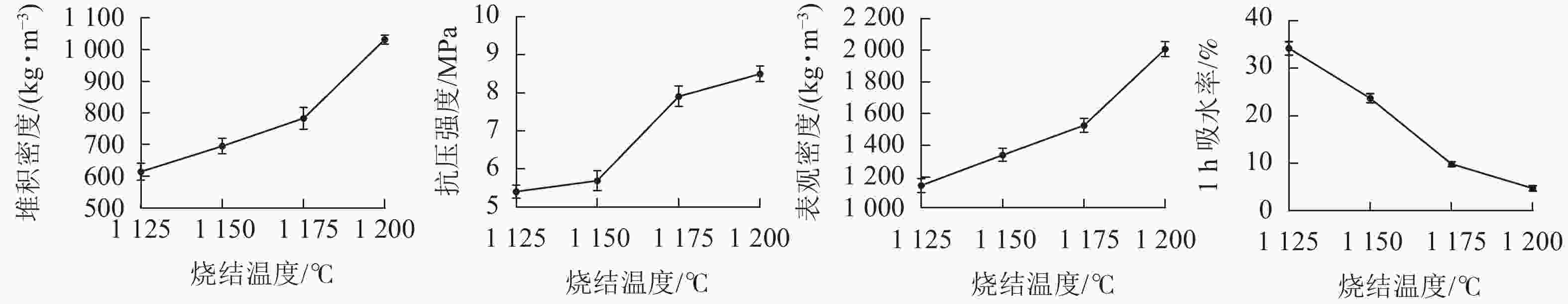 在预热温度为400 ℃,预热时间为20 min时,分别在1 125、1 150、1 175和1 200 ℃温度下烧结15 min制备了4种不同烧结温度的陶粒,测定陶粒的基本性质。从图1可见:随着烧结温度的升高,陶粒的抗压强度逐渐上升,在1 150 ℃之前抗压强度较小,且增长缓慢。当烧结温度从1 150 ℃上升到1 175 ℃时,陶粒抗压强度有较大的提高,而当烧结温度进一步由1 175 ℃提高1 200 ℃时,陶粒抗压强度变化较小,趋于稳定。说明陶粒在未达到最佳烧结温度之前,适当提高温度可以促进烧结[22]。陶粒的堆积密度、表观密度和1 h吸水率的重要转折点均在1 175 ℃。说明这个温度前后陶粒内部发生大量物理化学反应,较多釉质层在这时产生,填充了陶粒内部空隙,陶粒孔隙率有所下降,同时在液相的作用下,陶粒体积逐渐收缩,导致陶粒的堆积密度和抗压强度增加,吸水率下降[23]。所以最佳烧结温度为1 175 ℃。