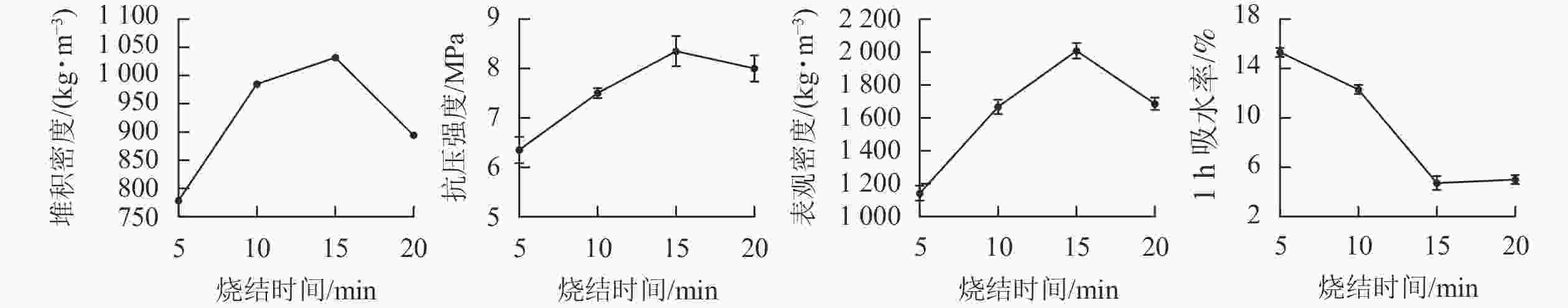 在预热温度为400 ℃,预热时间为20 min,烧结温度为1 200 ℃时,分别烧制5、10、15和20 min,制备4种不同烧结时间的陶粒。从图2可见:烧制5、10、15和20 min的陶粒抗压强度依次为6.35、7.50、8.35和8.00 MPa;堆积密度依次为778.5、985.0、1 031.7和894.4 kg·m−3;表观密度依次为1 141.4、1 666.7、2 007.2和1 685.0 kg·m−3。陶粒1 h的吸水率先降低后升高,其中在10~15 min的变化幅度最大,从12.3%降低至4.7%,烧结时间在15 min时,陶粒1 h吸水率达到了最低点符合国家标准中对建筑轻集料陶粒要求,所以最佳烧结时间为15 min。