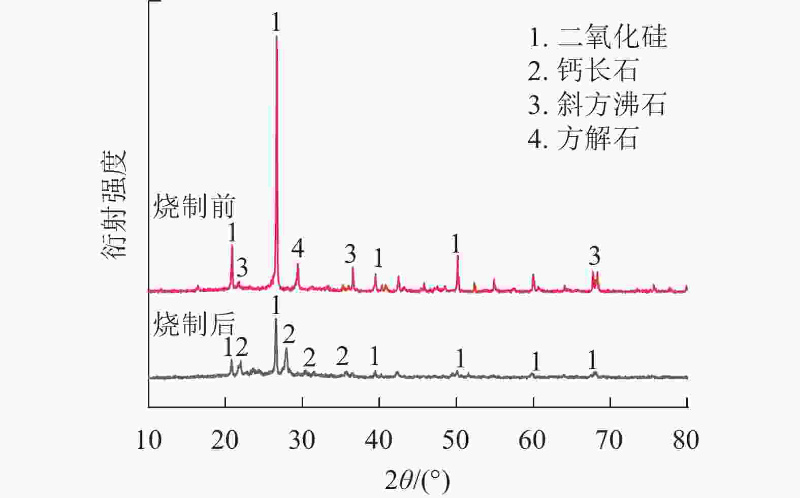 由图6可知:在最佳烧制条件下,生陶粒主要含有石英、方解石和斜方沸石,烧制后陶粒主要为石英和钙长石。陶粒主要结晶相为SiO2,这与前期研究结果一致[27]。烧制后的SiO2衍射峰显著降低,说明烧结过程中陶粒表面有大量熔融物质产生,形成一定体量的釉质层,有效提高了陶粒抗压强度。斜方沸石衍射峰减弱,钙长石衍射峰增强,说明陶粒烧制过程中一部分的斜方沸石转化成为了钙长石。