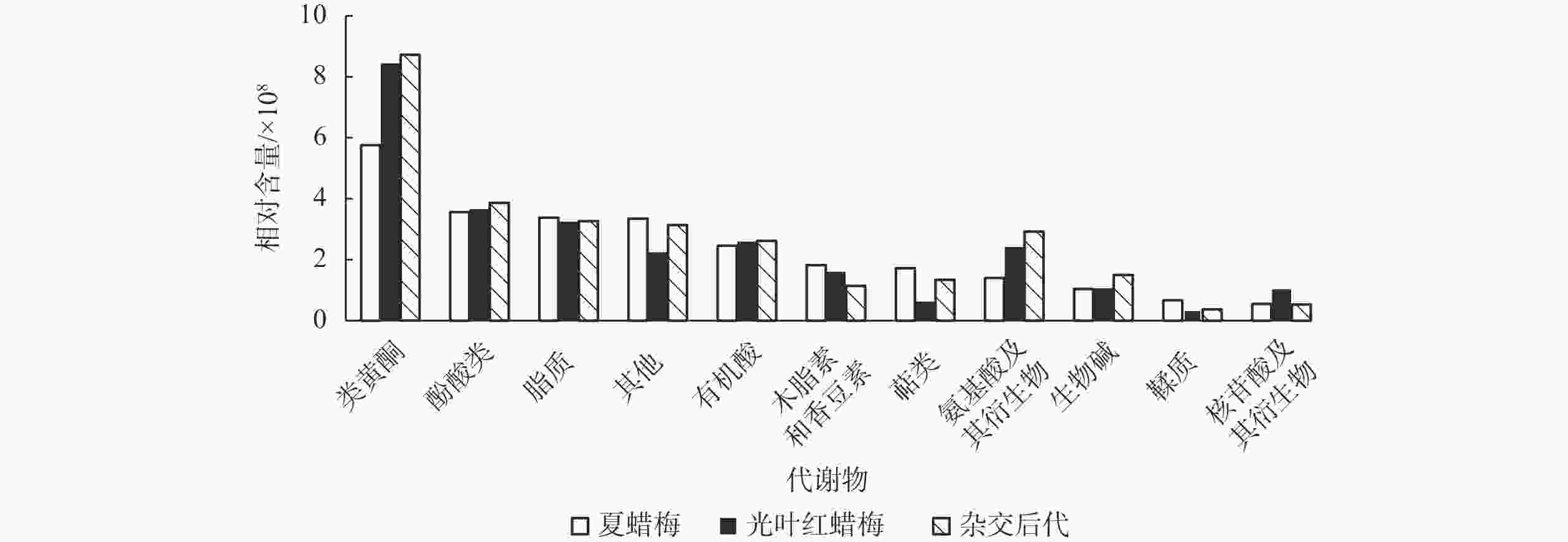 植物 相对含量 花青素 黄酮 黄酮醇 查尔酮 夏蜡梅 4.40×107 2.71×108 9.38×107 7.02×106 光叶红蜡梅 6.21×107 3.68×108 2.92×108 4.94×106 杂交后代 7.51×107 3.78×108 2.64×108 5.28×106 -