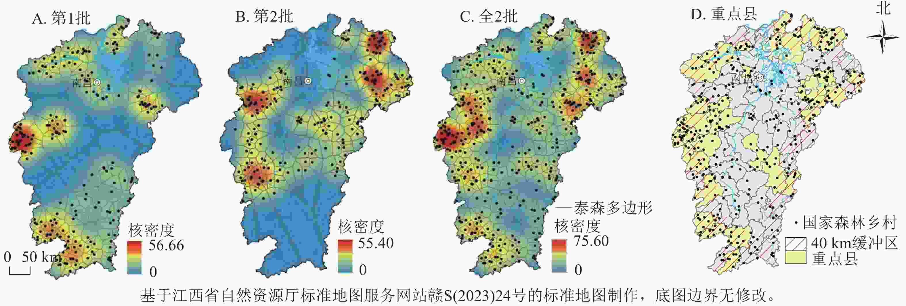 江西“三面环山”的特征奠定了其国家森林乡村密迩省界边缘的地缘格局(图2D):①省界边缘区内国家森林乡村占比大。430个国家森林乡村距离省界平均距离约39.51 km。以江西省省界向省域范围内作40.00 km缓冲区,利用位置选择工具,统计该范围内分布国家森林乡村253个,占全省58.84%,说明江西近60%的国家森林乡村是“沿边”分布的。②省界边缘区内国家森林乡村重点县占比大。37个森林乡村重点县中,有32个位于省界40.00 km缓冲区范围内,占86.49%。③省界边缘区内国家森林乡村核密度高值区占比大。分别计算第1、2批和全2批国家森林乡村的核密度值,发现均具有“多核-沿边”分布特征,并几乎全部位于省界40.00 km缓冲区范围内。